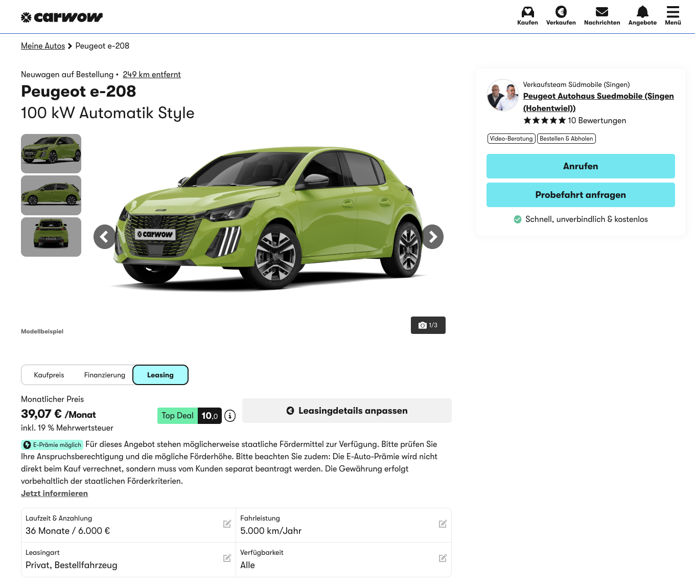 Ein vollelektrischer City-Flitzer, der beim Preis überrascht. Peugeot e-208 100 kW Style bei carwow für nur 39,07 Euro brutto im Monat wirkt auf den ersten Blick fast zu günstig, wird jedoch durch eine Sonderzahlung von 6.000 Euro ermöglicht. Rechnet man diese auf die Laufzeit um, ergibt sich eine realistische Monatsrate von 205,74 Euro, die den Deal deutlich besser vergleichbar macht.