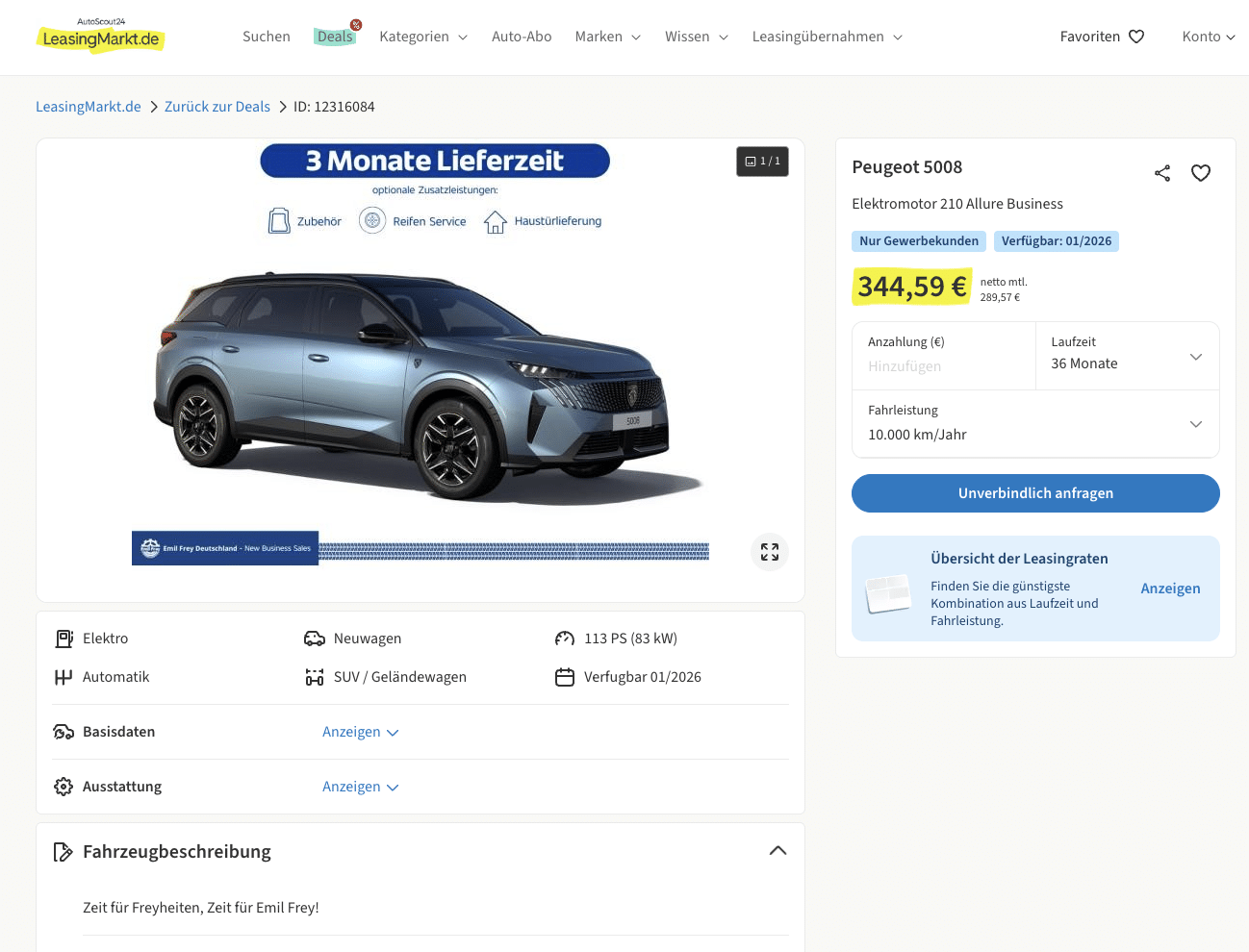 LeasingMarkt hat den Peugeot 5008 „Elektromotor 210“ Allure Business im Programm, ein vollelektrisches XXL-SUV, das Platz, Reichweite und Kalkulierbarkeit sauber zusammenbringt. Der Deal startet für 289,57 Euro netto pro Monat, gerechnet mit 36 Monaten Laufzeit und 10.000 km pro Jahr. Es handelt sich um einen konfigurierbaren Neuwagen aktuell in Ingaro Blau gelistet. Eine Wunschlackierung gibt es für 7 Euro/Monat. Die Lieferzeit liegt bei drei Monaten.