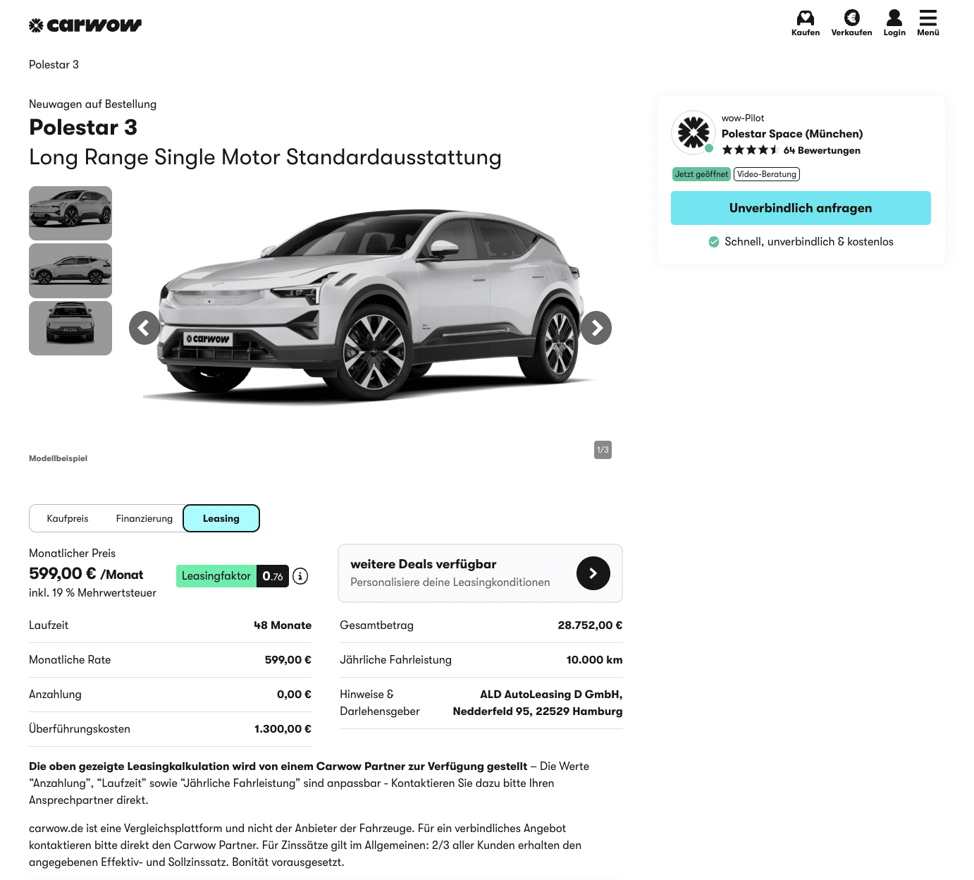 Carwow hat den Polestar 3 Long Range Single Motor 220 kW als Bestellfahrzeug für 599 Euro brutto im Monat im Programm, 48 Monate, 10.000 km pro Jahr, Lieferzeit rund drei Monate, nur solange der Vorrat reicht. Ihr stellt Lack, Felgen und Ausstattungspakete nach euren Prioritäten zusammen, ihr definiert den Look, carwow liefert die Kalkulation.
