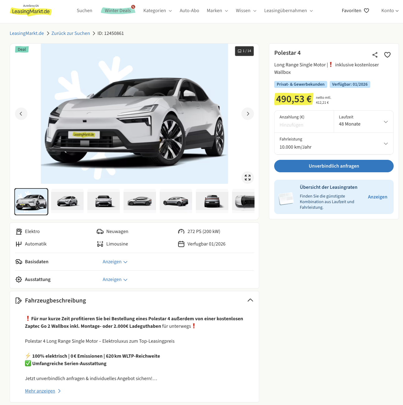 Ein Elektroauto mit großer Reichweite ist das eine, ein Paket, bei dem Zuhause laden direkt mitgeliefert wird, ist das andere. Genau hier setzt dieses Angebot an. Den Polestar 4 Long Range Single Motor gibt es bei LeasingMarkt für 491 Euro brutto im Monat, kalkuliert im Privatleasing mit 48 Monaten Laufzeit und 10.000 Kilometern pro Jahr. Das Fahrzeug ist bereits bestellt und soll ab Januar 2026 bereitstehen. Der eigentliche Joker steckt im Bonus: Ihr bekommt entweder eine Zaptec Go 2 Wallbox inklusive Montage kostenlos oder 2.000 Euro Ladeguthaben on top. So startet die E-Mobilität nicht nur mit einem starken Auto, sondern mit einem fertigen Ladepaket.