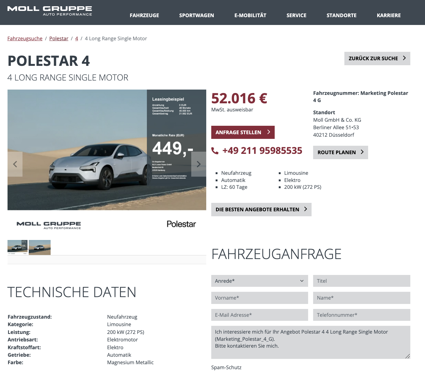 Der Polestar 4 steht für ein radikal reduziertes Design und ein elektrisches Setup, das Langstrecke ernst nimmt. Beim Autohaus Moll können Geschäftskunden den Polestar 4 Long Range Single Motor für 449 Euro netto pro Monat leasen, kalkuliert mit 48 Monaten Laufzeit und 10.000 Kilometern pro Jahr. Es handelt sich um eine Bestellaktion, der Polestar kann individuell konfiguriert werden, von der Farbe über das Interieur bis zu den Ausstattungspaketen.