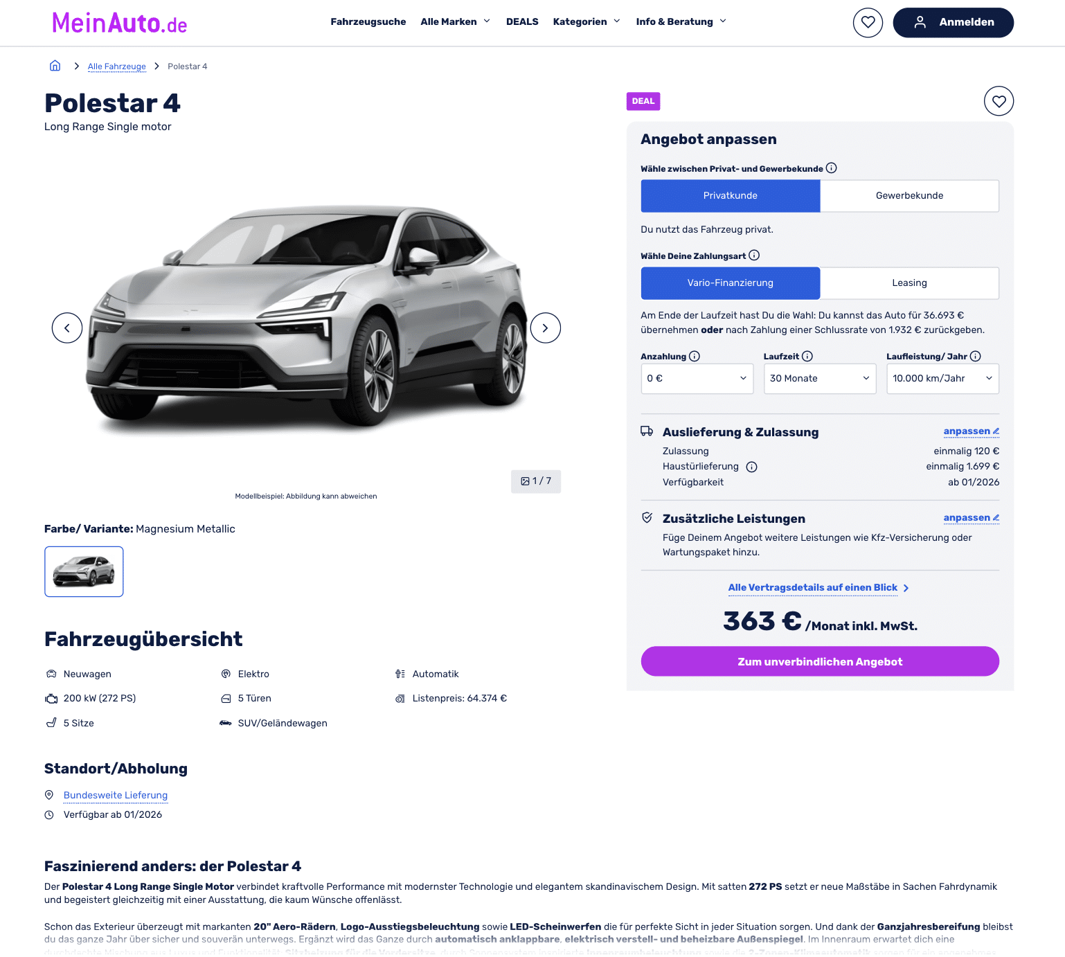 Das Angebot bei MeinAuto läuft über 30 Monate und 10.000 km pro Jahr, beides lässt sich an euer Fahrprofil anpassen, der Vario-Monatspreis von 363 Euro brutto bleibt die klare Hausnummer.