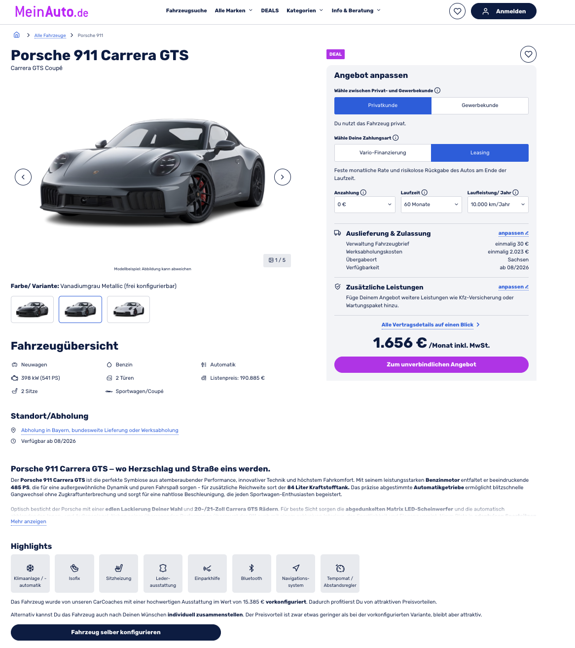 Ein Porsche ist ein seltener Gast bei uns. MeinAuto bietet den Porsche 911 Carrera GTS als Coupé mit Hybridantireb für 1656 Euro im Monat brutto an. Kalkuliert wird das Leasing auf 60 Monate und 10.000 Kilometer pro Jahr. Wer sich am Ende lieber alle Optionen offenhält, kann alternativ das Vario-Leasing für 1.571 Euro brutto im Monat wählen. Dann entscheidet ihr nach der Laufzeit, ob der Porsche übernommen wird, die Kaufoption liegt bei 120.258 Euro, oder ob die Rückgabe gegen eine Schlussrate von 5.727 Euro erfolgt.