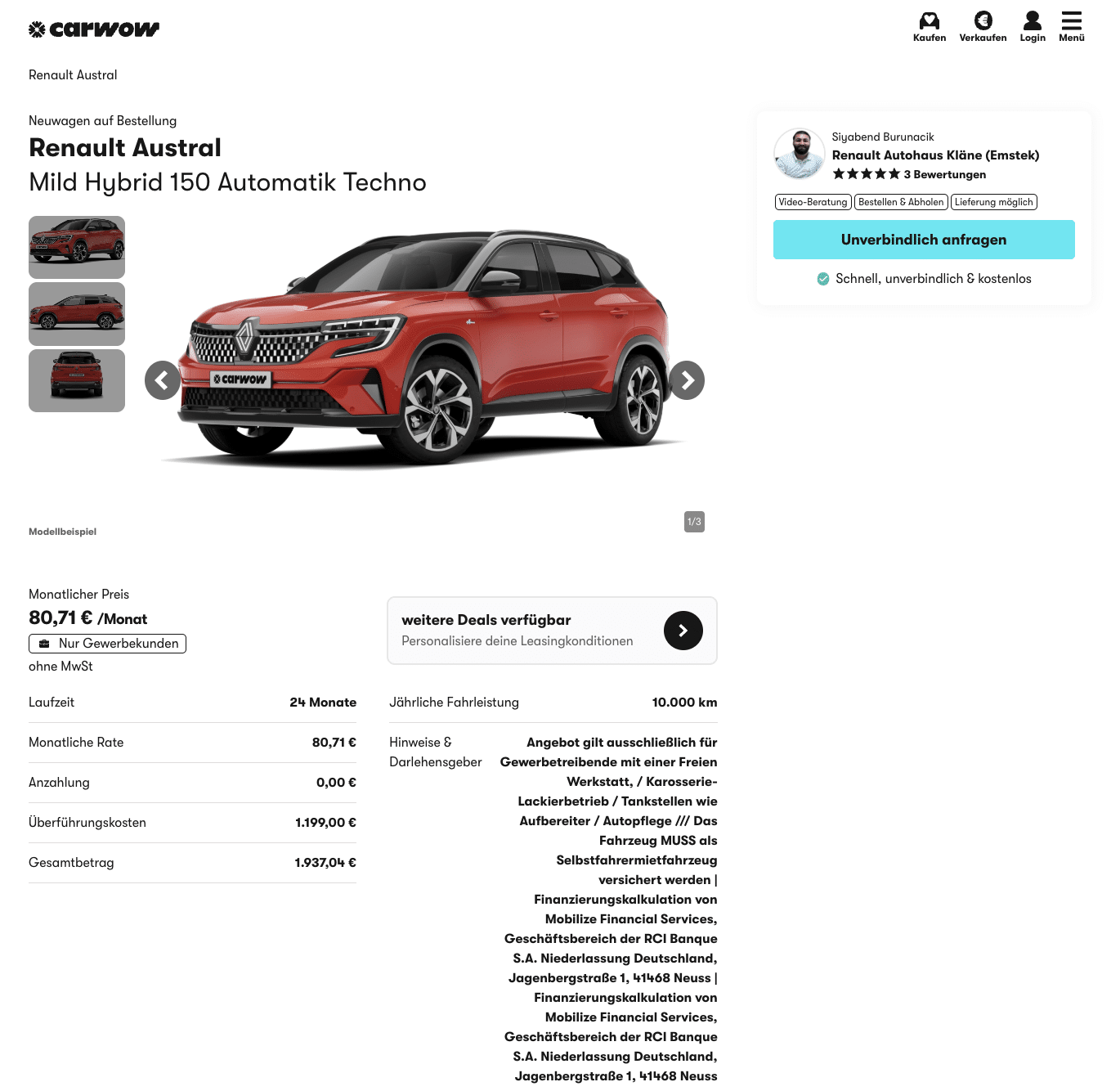 Ein Deal mit klaren Spielregeln und starkem Preis! Bei carwow gibt es ein Angebot ausschließlich für KFZ Gewerbetreibende. Angebot wird der Renault Austral Mild Hybrid 150 Automatik Techno für nur 80,71 Euro im Monat netto. Teilnehmen können z. B. freie Werkstätten, Karosserie- und Lackierbetriebe, Tankstellen, Fahrzeugaufbereiter und Autopflege-Betriebe. Wichtig: Die Versicherung als Selbstfahrermietfahrzeug ist Voraussetzung. Das SUV wird frei konfigurierbar als Bestellfahrzeug angeboten; die Lieferzeit liegt bei rund drei bis vier Monaten, genug Spielraum, um Ausstattung und Farbe exakt auf euren Fuhrpark oder euren Markenauftritt abzustimmen.