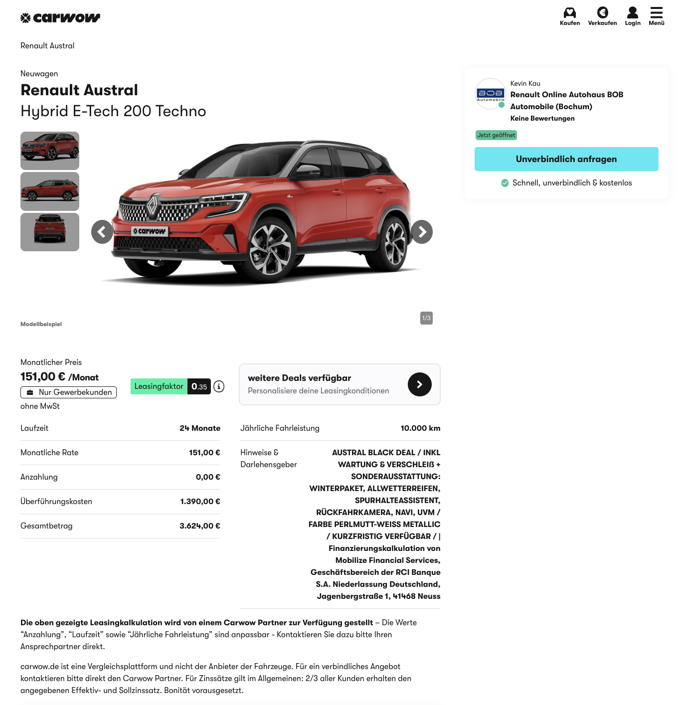 Bei carwow steht euer Renault Austral Hybrid E-Tech 200 Techno im Full-Service-Leasing für 151 Euro netto pro Monat bereit, ausschließlich für Geschäftskunden. Das Fahrzeug ist bereits bestellt, damit kurzfristig verfügbar, geordert in Perlmutt Weiß Metallic. Im Paket sind Winterpaket, Allwetterbereifung, Spurassistenten und eine Rückfahrkamera enthalten. Das Full-Service-Paket deckt Wartungs- und Verschleißarbeiten ab, wodurch die Betriebskosten über die Laufzeit angenehm planbar bleiben.