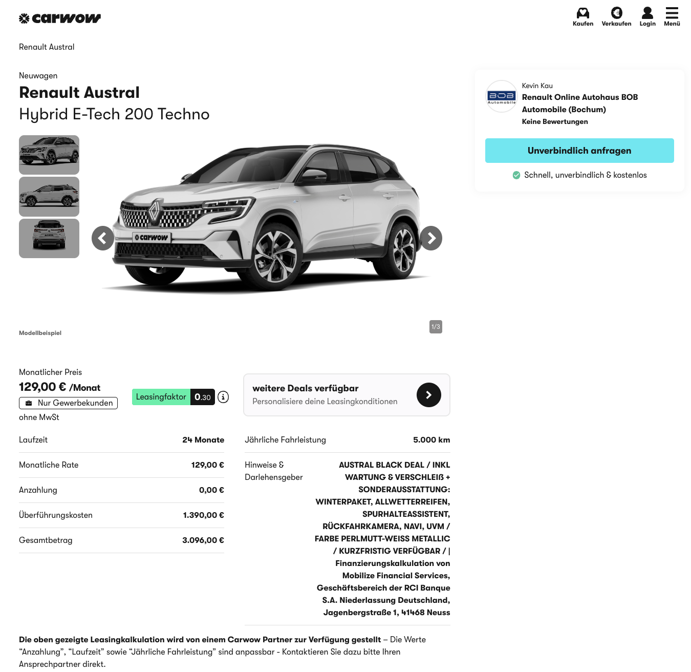Der zweite Advent 🕯️🕯️ bringt nicht nur mehr Licht ins Wohnzimmer, sondern kann auch frischen Glanz in den Fuhrpark bringen. Bei carwow steht der Renault Austral Hybrid E Tech 200 Techno aktuell für 129 Euro netto im Monat im Geschäftsleasing bereit, inklusive Wartung und Verschleiß. Das SUV ist kurzfristig verfügbar und in der Farbe Perlmutt Weiß Metallic erhältlich.
