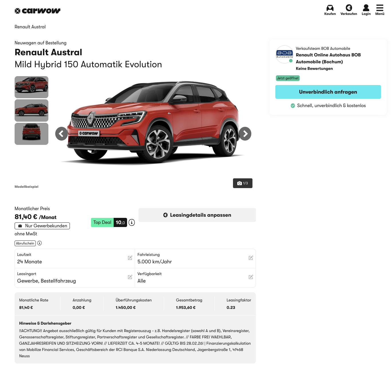 Der Renault Austral ist ein modernes SUV für den Fuhrpark, effizient, komfortabel und digital gut ausgestattet. Bei carwow gibt es den Renault Austral Mild Hybrid 150 Automatik Evolution für 81,40 Euro netto pro Monat, ausschließlich für Geschäftskunden oder Organisationen mit Registereintrag, etwa im Handelsregister, Vereinsregister, Genossenschaftsregister, Stiftungsregister, Partnerschaftsregister oder Gesellschaftsregister. Als Bestellfahrzeug ist das Modell frei konfigurierbar, die Lieferzeit liegt bei rund drei bis vier Monaten. Auffällig ist zudem der Leasingfaktor von 0,28, der das Angebot im Gewerbevergleich sehr attraktiv macht.