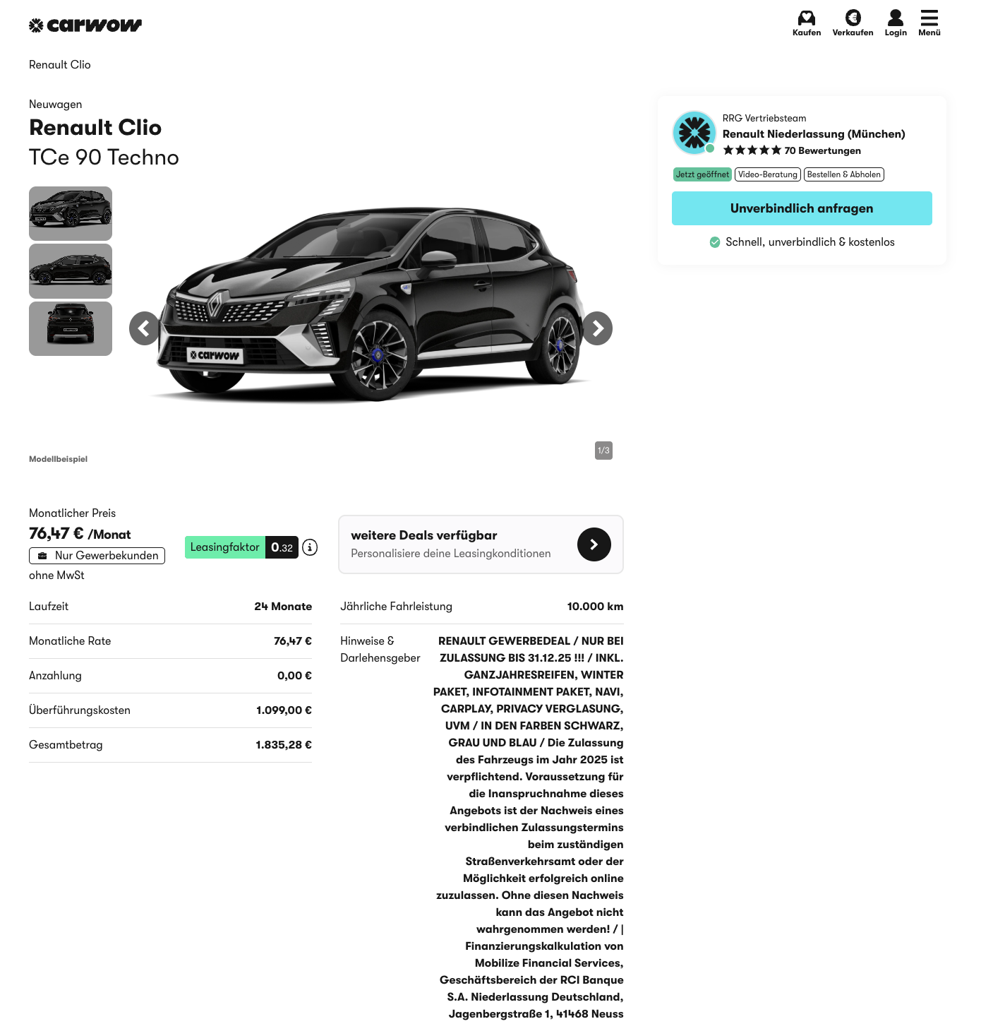 Das Angebot ist auf 24 Monate Laufzeit und 10.000 Kilometer pro Jahr kalkuliert, damit bleibt der Clio ein überschaubares Projekt im Fuhrpark. Spannend ist der Blick zum Markt, beim Platzhirsch ist der Clio mit TCe 90 Motor aktuell nicht mehr zu bekommen, während carwow ihn zum Nikolaustag mit klarer Rate und starkem Faktor in die Auslage stellt.