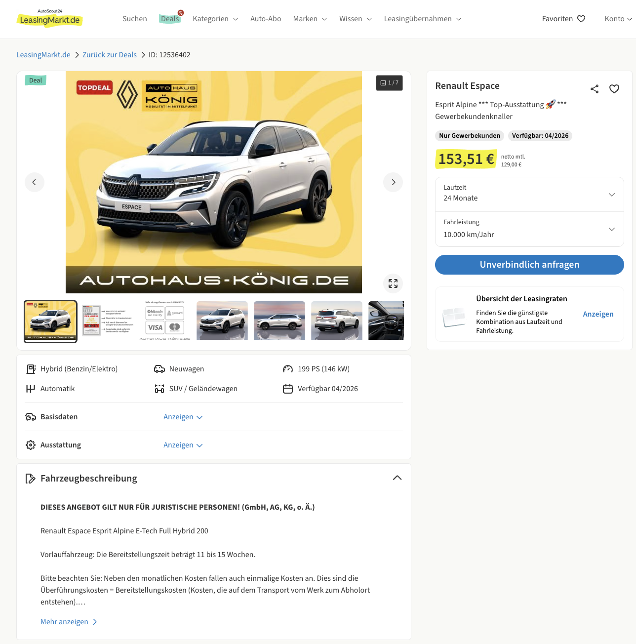 Groß, komfortabel und erstaunlich effizient, der Renault Espace. Den Renault Espace Full Hybrid E-Tech 200 5-Sitzer Esprit Alpine gibt es bei LeasingMarkt für 129 Euro im Monat netto, allerdings ausschließlich für juristische Personen, also etwa GmbH, AG, KG oder vergleichbare Unternehmensformen. Wichtig ist auch: Es handelt sich um die 5 Sitz Variante. Das Fahrzeug ist bereits bestellt, und mit einer Bereitstellungszeit von 11 bis 15 Wochen ist die Wartezeit überschaubar. Geliefert wird der Espace in Perlmutt Weiß, was den Esprit Alpine Auftritt besonders hochwertig wirken lässt.