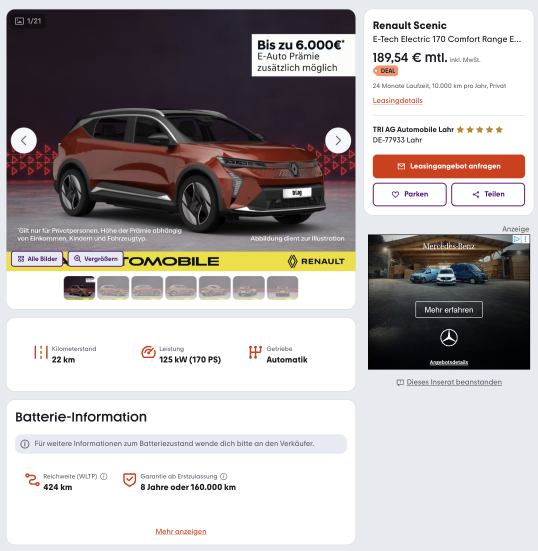 Der Renault Scénic E-Tech Electric bringt moderne Elektromobilität bezahlbar ins SUV-Format. Privatkunden können bei carwow den Renault Scénic E-Tech Electric 170 Comfort Range Evolution für 189,54 Euro brutto pro Monat leasen, als Bestellfahrzeug mit rund drei Monaten Lieferzeit. Laut Anzeige ist zusätzlich eine Umweltprämie möglich, was das Angebot weiter interessant machen kann.
