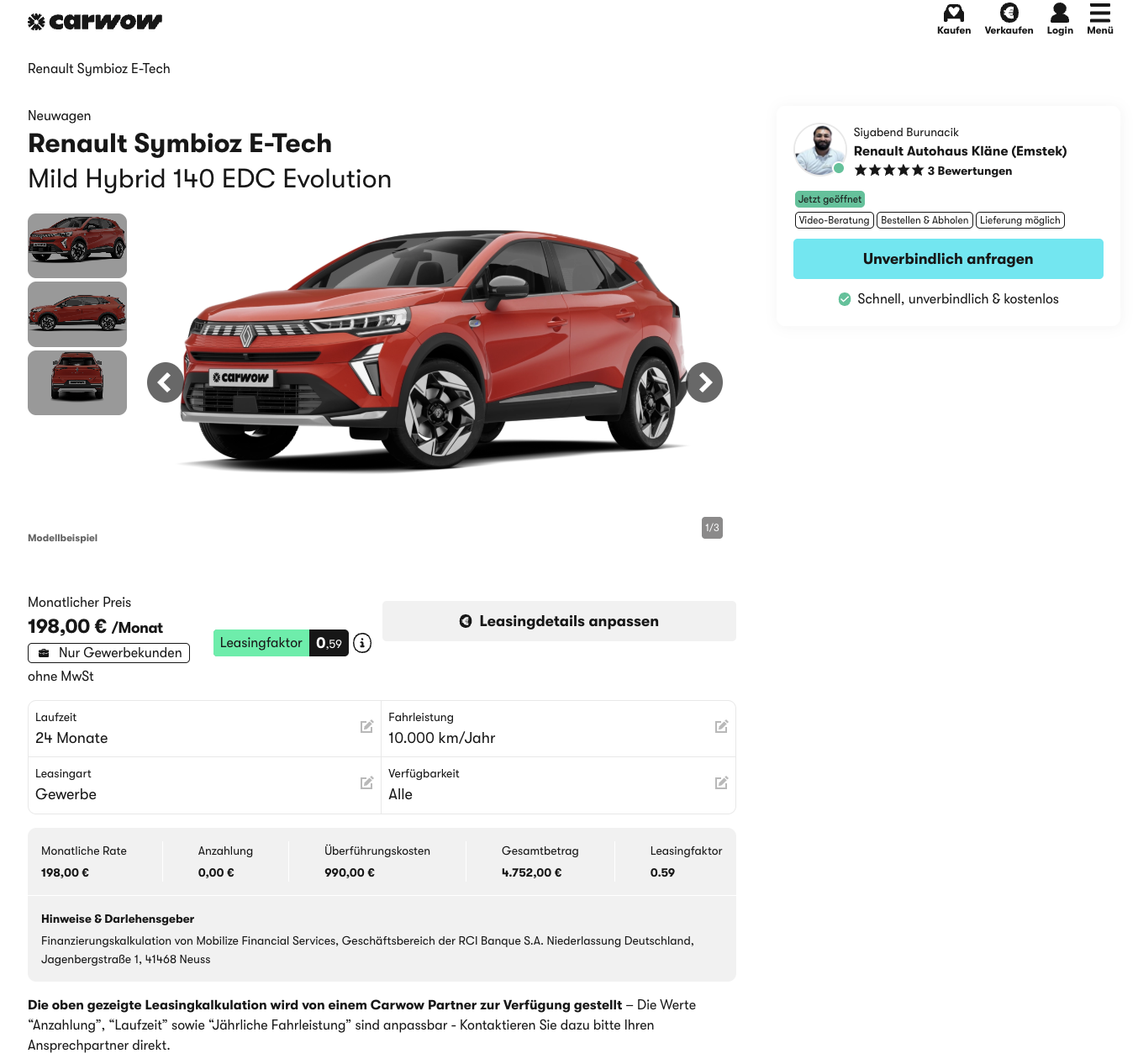 🎄 Renault Symbioz Leasing für 198 Euro im Monat netto