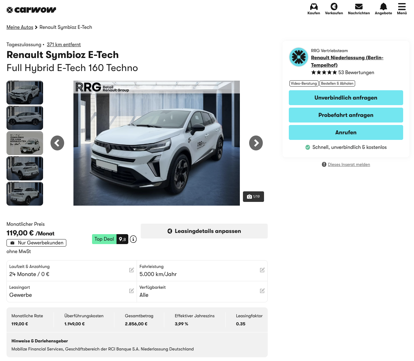 Der Renault Symbioz bringt frischen Wind in die Kompakt-SUV-Klasse und setzt klar auf Effizienz und Raumgefühl. Renault Symbioz E-Tech Full Hybrid 160 Techno mit Tageszulassung bei carwow für 119 Euro netto im Monat zeigt, wie attraktiv moderne Hybridtechnik kalkuliert sein kann. Das Angebot richtet sich an Geschäftskunden und kombiniert niedrige Einstiegskosten mit sofort verfügbarer Mobilität.