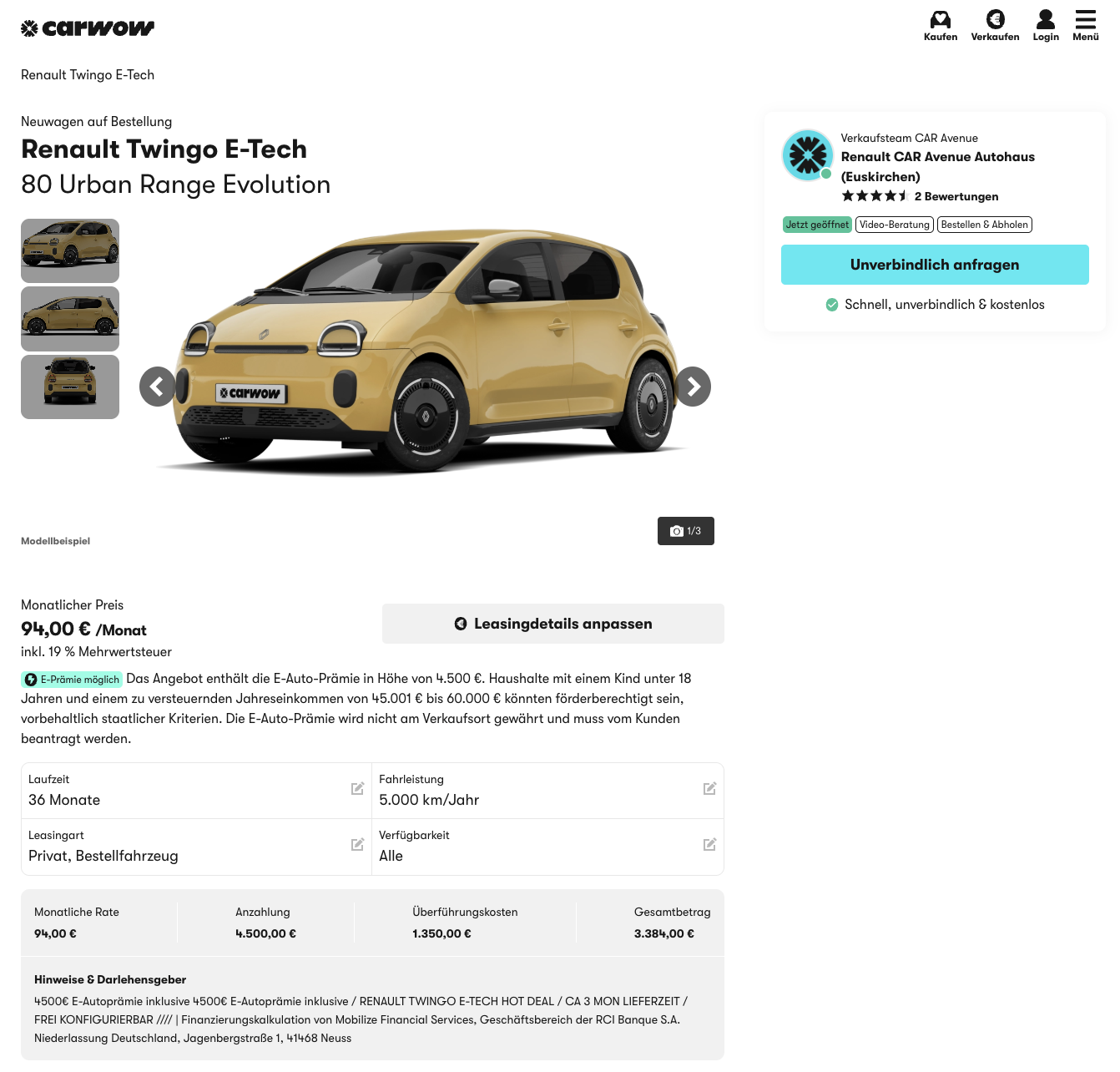 Renault Twingo Leasing für 94 [219] Euro im Monat brutto [frei konfigurierbar, Umwelt]