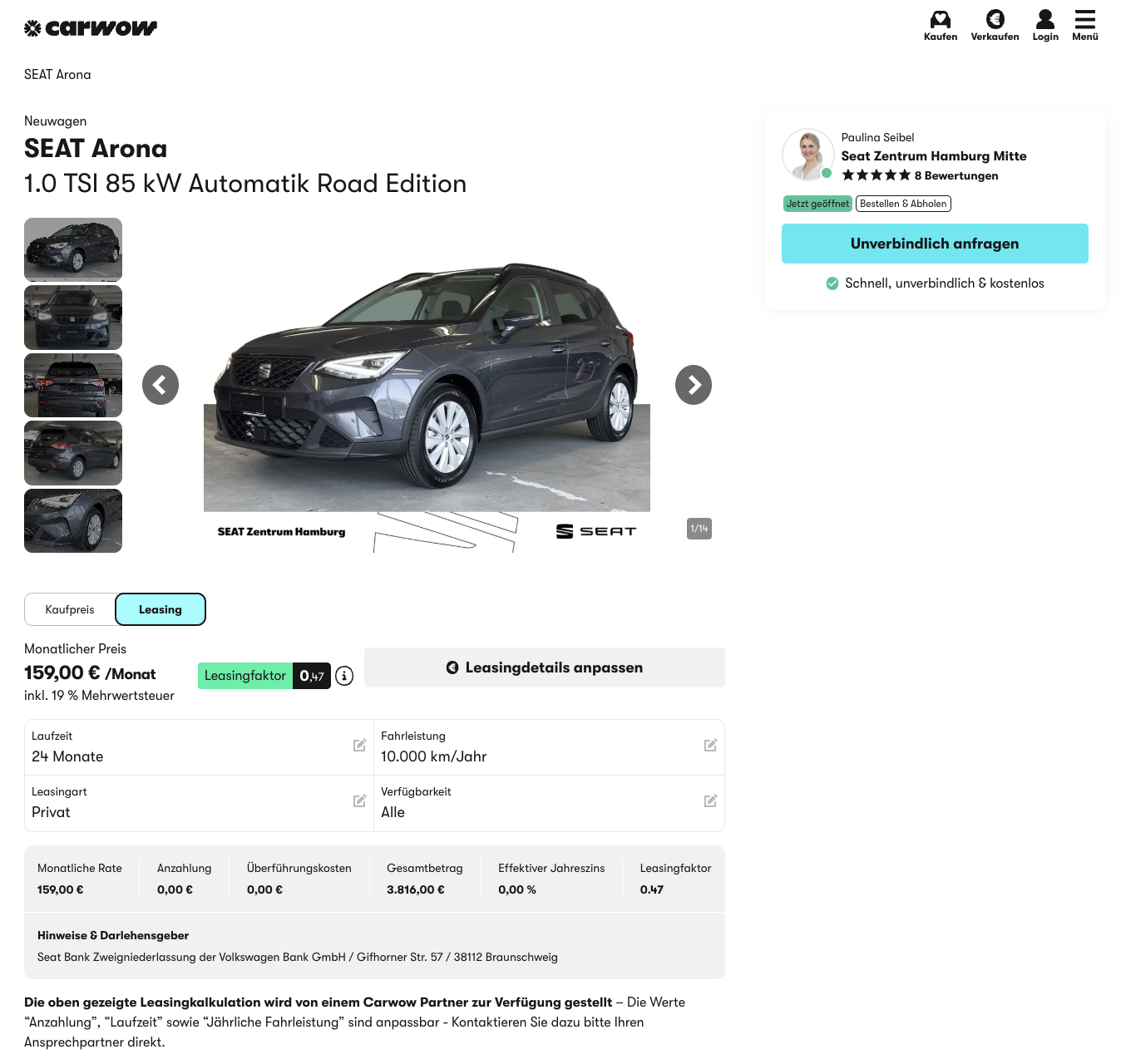 Der Seat Arona ist ein urbanes SUV, das genau dann überzeugt, wenn ein Auto täglich liefern muss, übersichtlich, handlich, und trotzdem mit genug Raum für Alltag und Wochenende. Bei carwow gibt es den Seat Arona 1.0 TSI 85 kW DSG Road Edition im Privatleasing für 159 Euro brutto pro Monat, mit einem Leasingfaktor von 0,47.