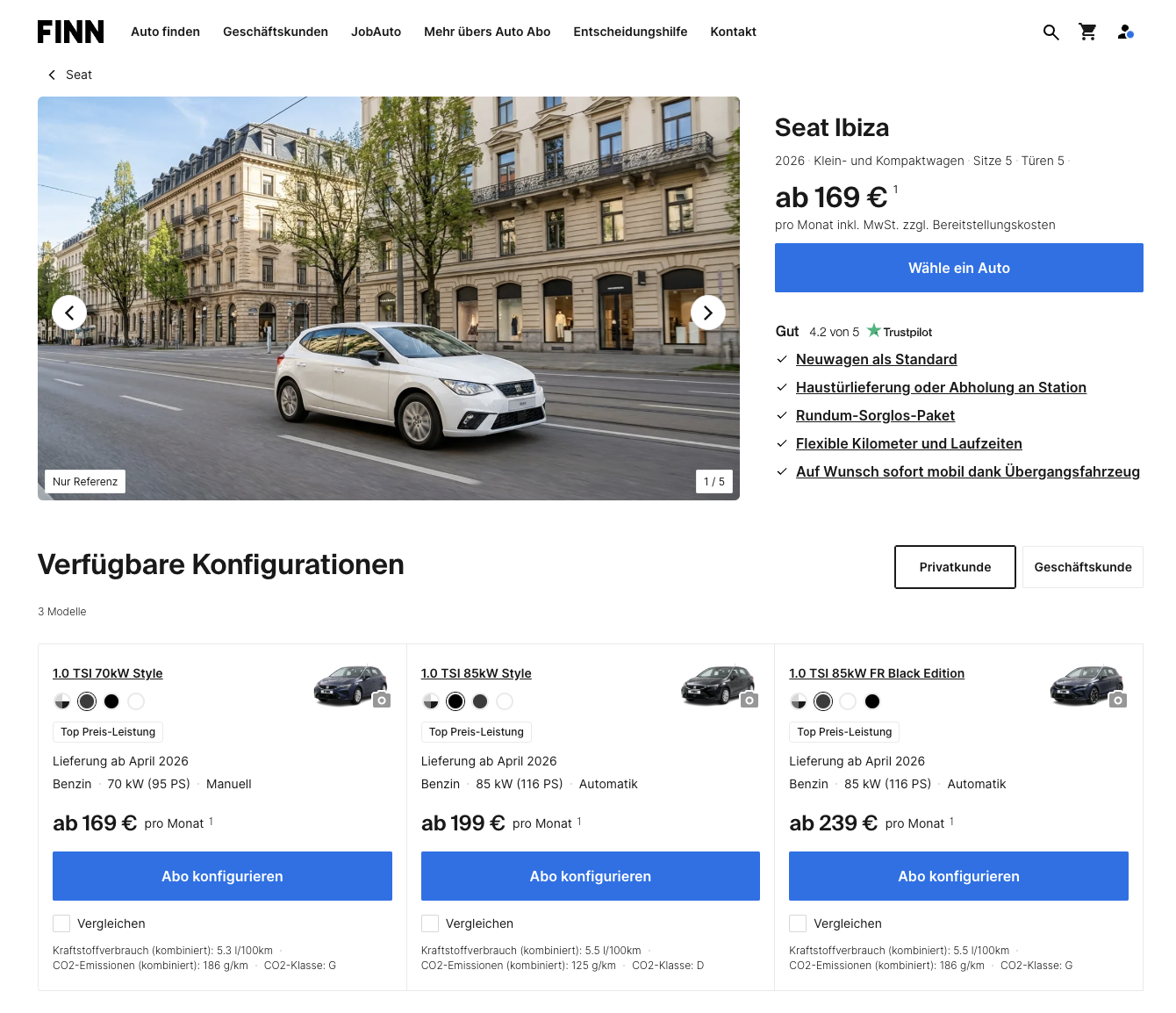 Der Seat Ibiza steht seit Jahren für einen gelungenen Mix aus Design, Effizienz und Alltagstauglichkeit im Kleinwagensegment. Sichert euch den Seat Ibiza 1.0 TSI 70 kW Style bei FINN im Auto-Abo für 169 Euro brutto im Monat, kalkuliert mit 12 Monaten Laufzeit und 6.000 Kilometern Fahrleistung. Wer mehr unterwegs ist, kann ohne großen Sprung auf 12.000 Kilometer erhöhen, der Aufpreis beträgt lediglich 9 Euro pro Monat. Die Auslieferung ist zwischen April 2026 und Juni 2026 vorgesehen, damit bleibt genügend Planungssicherheit.