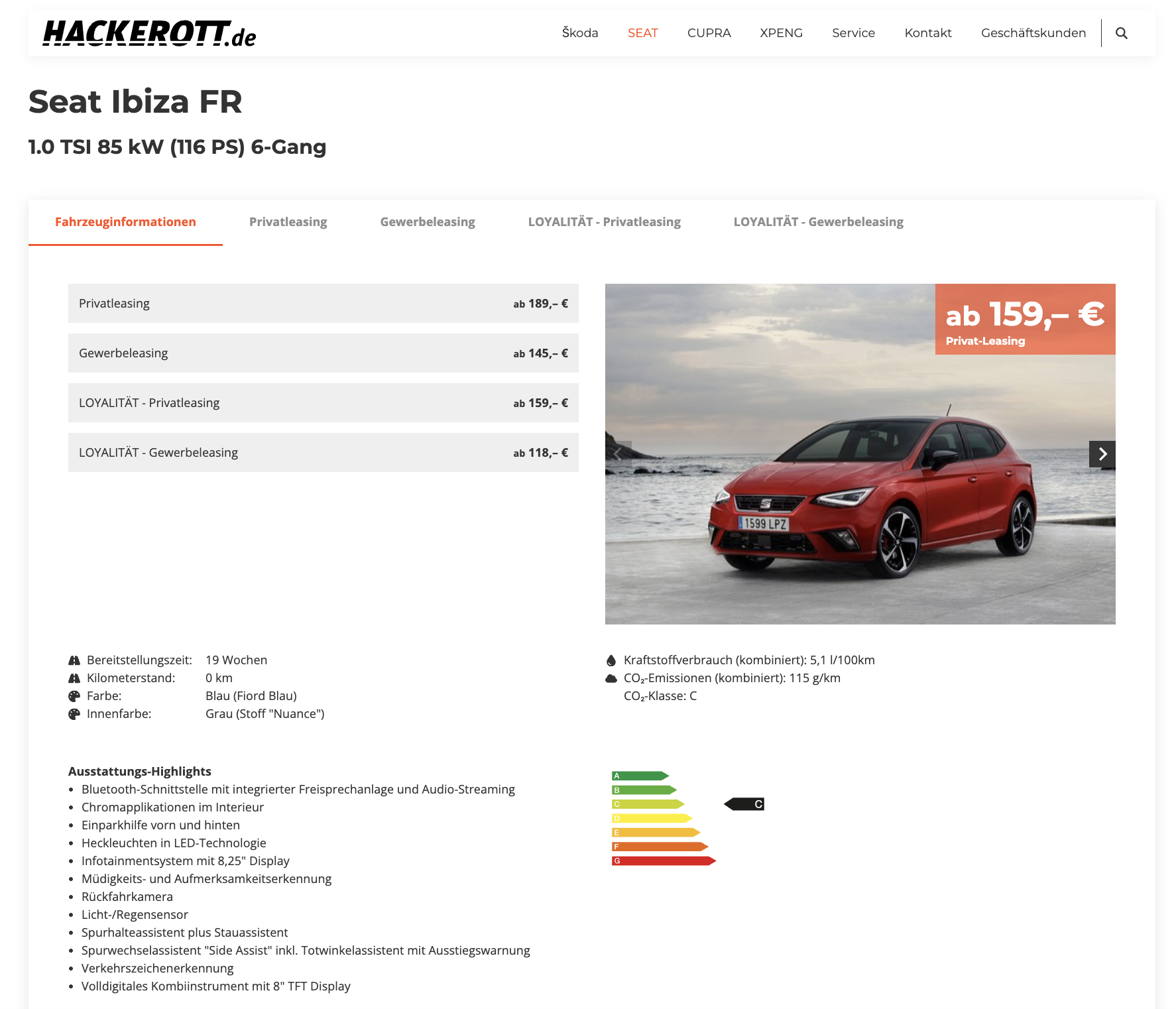 Treuebonus mit Sportfaktor! Wer schon mit Seat oder Cupra unterwegs ist, bekommt bei Hackerott gerade einen besonders reizvollen Einstieg in die FR Liga. Der Seat Ibiza 1.0 TSI 85 kW 6-Gang FR steht dort im Privatleasing für 159 Euro brutto im Monat, vorausgesetzt, ein Seat oder Cupra ist seit mindestens sechs Monaten auf euch zugelassen, egal ob gekauft, geleast oder finanziert. Das Angebot läuft über 24 Monate und 10.000 Kilometer pro Jahr, der Ibiza kommt als frei konfigurierbares Bestellfahrzeug, Farbe, Felgen und Ausstattung richtet ihr euch also nach eurem Geschmack ein. Ohne Loyalitätsprämie läge ihr bei 189 Euro im Monat bei 48 Monaten Laufzeit, treue Geschäftskunden starten sogar bei 118 Euro netto. Zum Vergleich, beim Platzhirsch werden für einen vergleichbaren Ibiza aktuell 215 Euro brutto pro Monat fällig.