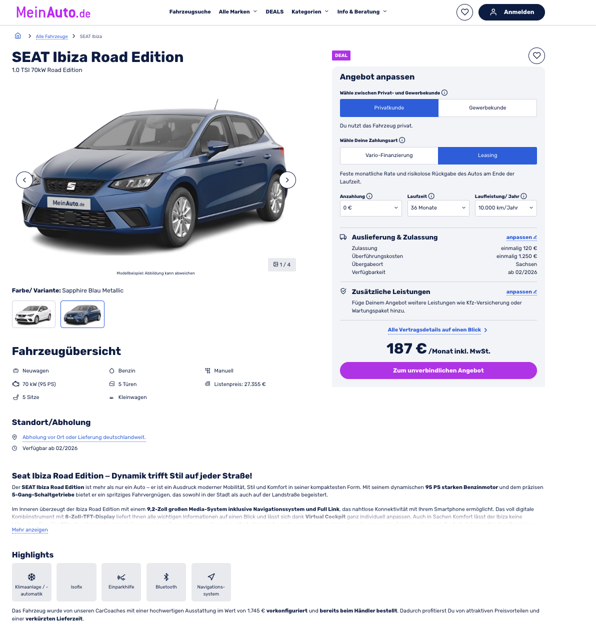 Kalkuliert ist das Angebot mit 36 Monaten Laufzeit und 10.000 Kilometern pro Jahr, beides lässt sich anpassen, wenn euer Fahrprofil mehr Strecke oder eine andere Laufzeit verlangt. Unterm Strich steht ein Ibiza, der modern ausgestattet ist, angenehm zu fahren bleibt und als vorkonfiguriertes Fahrzeug den Weg zur Auslieferung schon abkürzt.