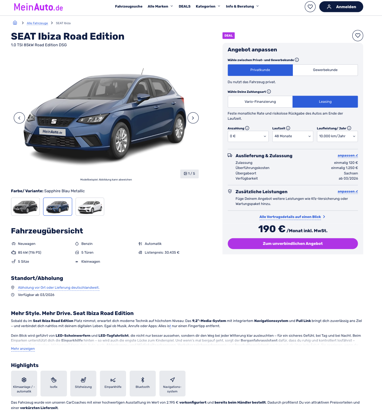 Kleinwagen mit erwachsenem Auftritt, der Seat Ibiza 1.0 TSI 85 kW DSG Road Edition. Bei MeinAuto gibt es den Ibiza für 190 Euro im Monat brutto im leasen. Es handelt sich um ein bereits bestelltes Fahrzeug, das ab März 2026 verfügbar sein soll. Farblich stehen Magnetic Grau Metallic, Sapphire Blau Metallic und Glacial White Metallic zur Auswahl.
