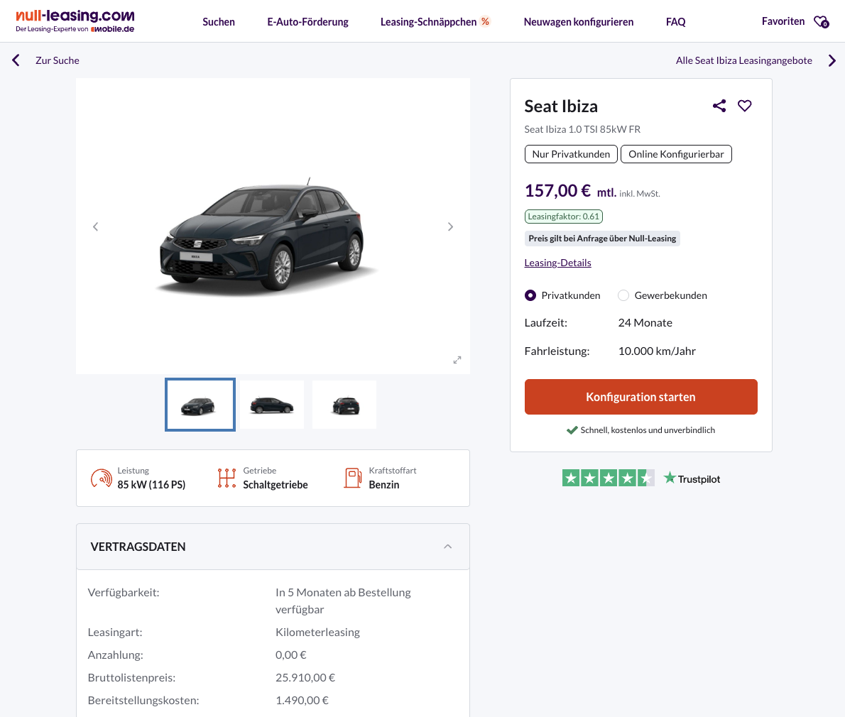 Der Seat Ibiza gehört seit Jahren zu den Modellen, die im Kleinwagensegment mehr bieten wollen als bloße Vernunft. Seat Ibiza 1.0 TSI 85 kW FR bei Null-Leasing für 157 Euro brutto im Monat ist deshalb ein Angebot, das vor allem für Privatkunden interessant wirkt, die einen kompakten Wagen mit sportlicher Note suchen, ohne beim Budget in ganz andere Regionen vorzudringen. Angeboten wird ein frei konfigurierbares Bestellfahrzeug, wodurch sich der Ibiza von der Lackierung bis zu den Details an den eigenen Geschmack anpassen lässt. Die aktuelle Lieferzeit liegt bei rund fünf Monaten.