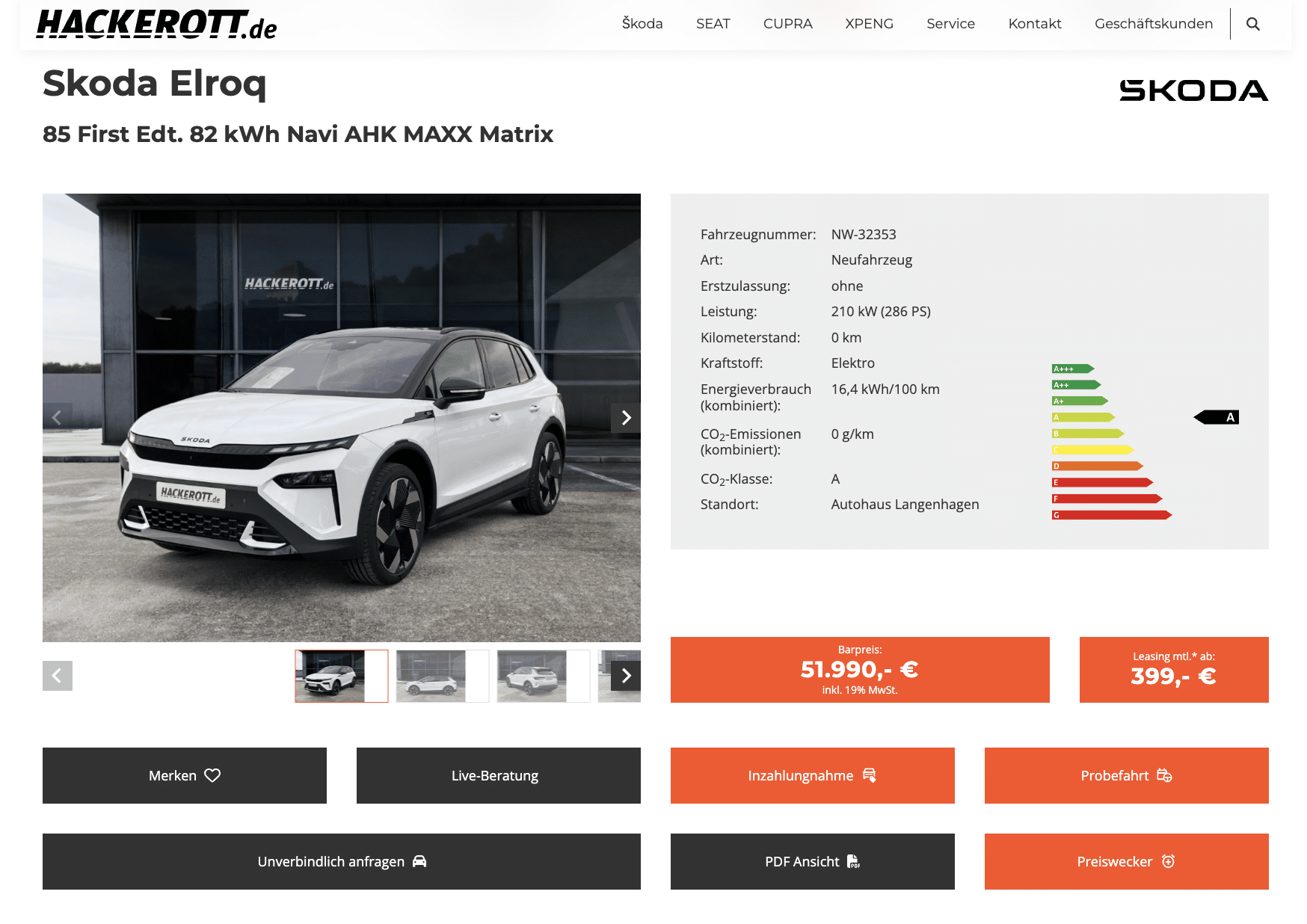 Ein neues Kapitel für Škoda. Bei Hackerott gibt es den Škoda Elroq 85 First Edition für 51.990 Euro brutto. Top ausgestattet, in edlem Moon-Weiß Perleffekt lackiert und sofort verfügbar. Ein Auto, das nicht lange auf einen Besitzer warten dürfte.