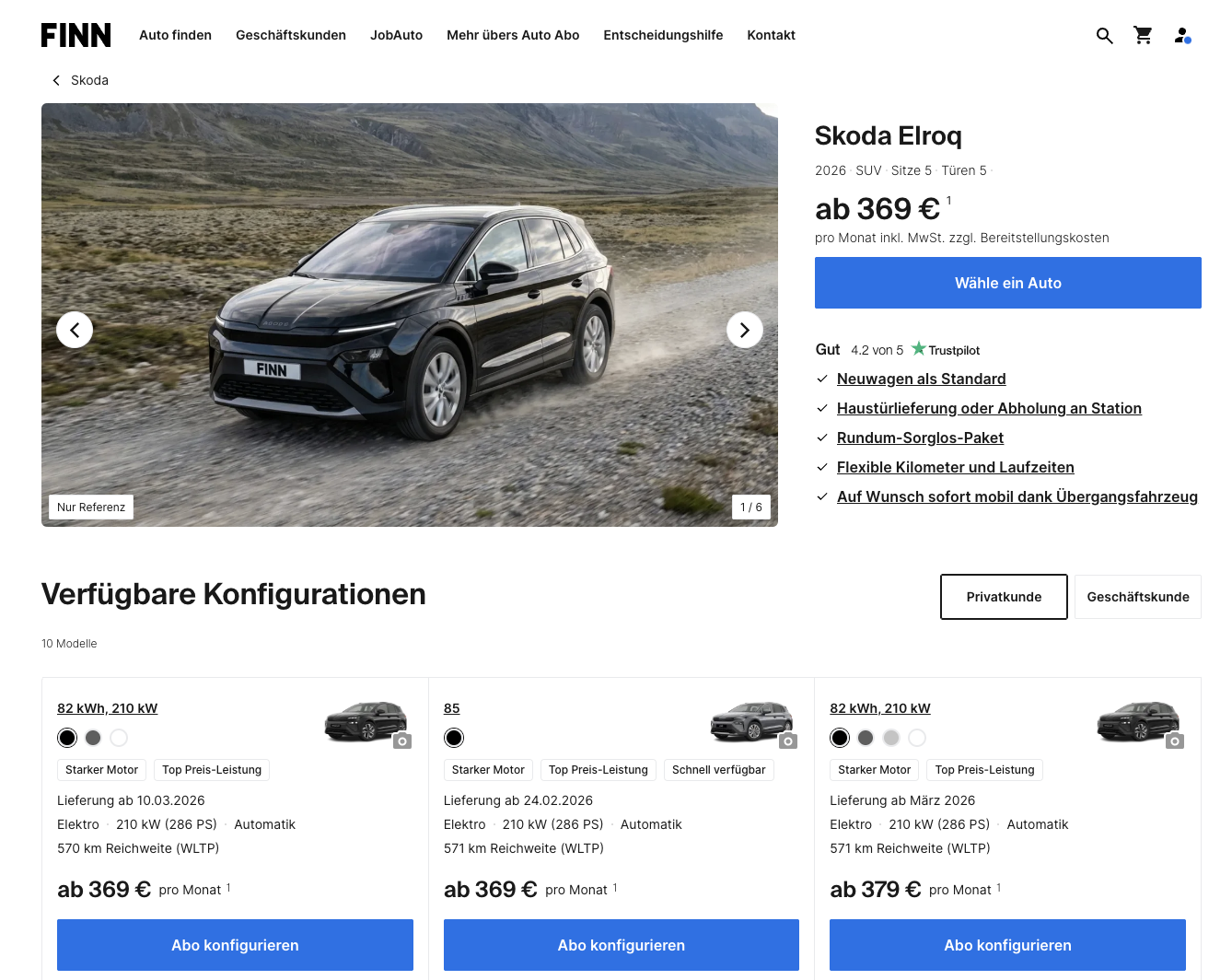 Der Škoda Elroq ist ein modernes Elektro-SUV für alle, die Reichweite, Platz und ein modernes Design suchen. Den Škoda Elroq gibt es bei FINN im All-inclusive Auto Abo für 369 Euro brutto pro Monat. Im All inclusive Abo sind Zulassung, TÜV, Inspektionen, Verschleiß und Reifenwechsel bereits enthalten, nur das Laden wird selbst bezahlt. Lieferung bis zur Haustür oder Abholung an einer Station sind möglich, und die Verfügbarkeit ist konkret genannt, lieferbar zwischen dem 10.03.2026 und dem 24.03.2026.