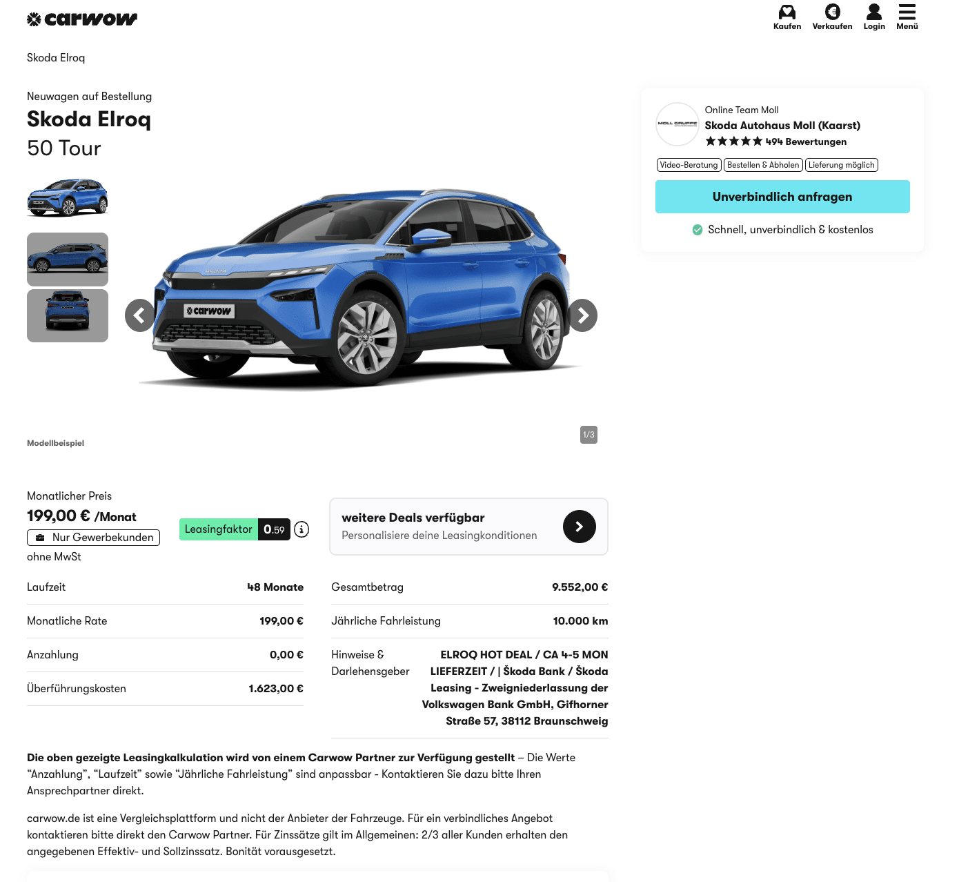 Das Angebot von carwow ist auf 48 Monate Laufzeit und 10.000 Kilometer pro Jahr ausgelegt. Während die Konkurrenz für vergleichbare Elektro-SUVs rund 325 Euro netto im Monat verlangt, liegt der Škoda Elroq 50 Tour mit 199 Euro deutlich darunter.