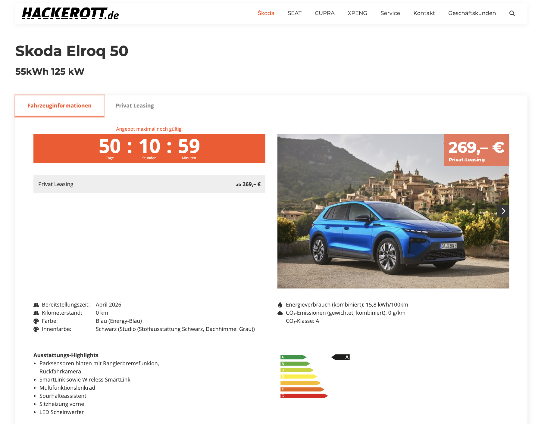 Kompakt, elektrisch und mit dem souveränen Auftritt. Hackerott biete den Škoda Elroq 50 im Privatleasing für 269 Euro brutto pro Monat an. Ein frei konfigurierbares Bestellfahrzeug, mit Bereitstellung ab April 2026. Die Beispielkalkulation steht auf 48 Monaten und 10.000 km/Jahr.