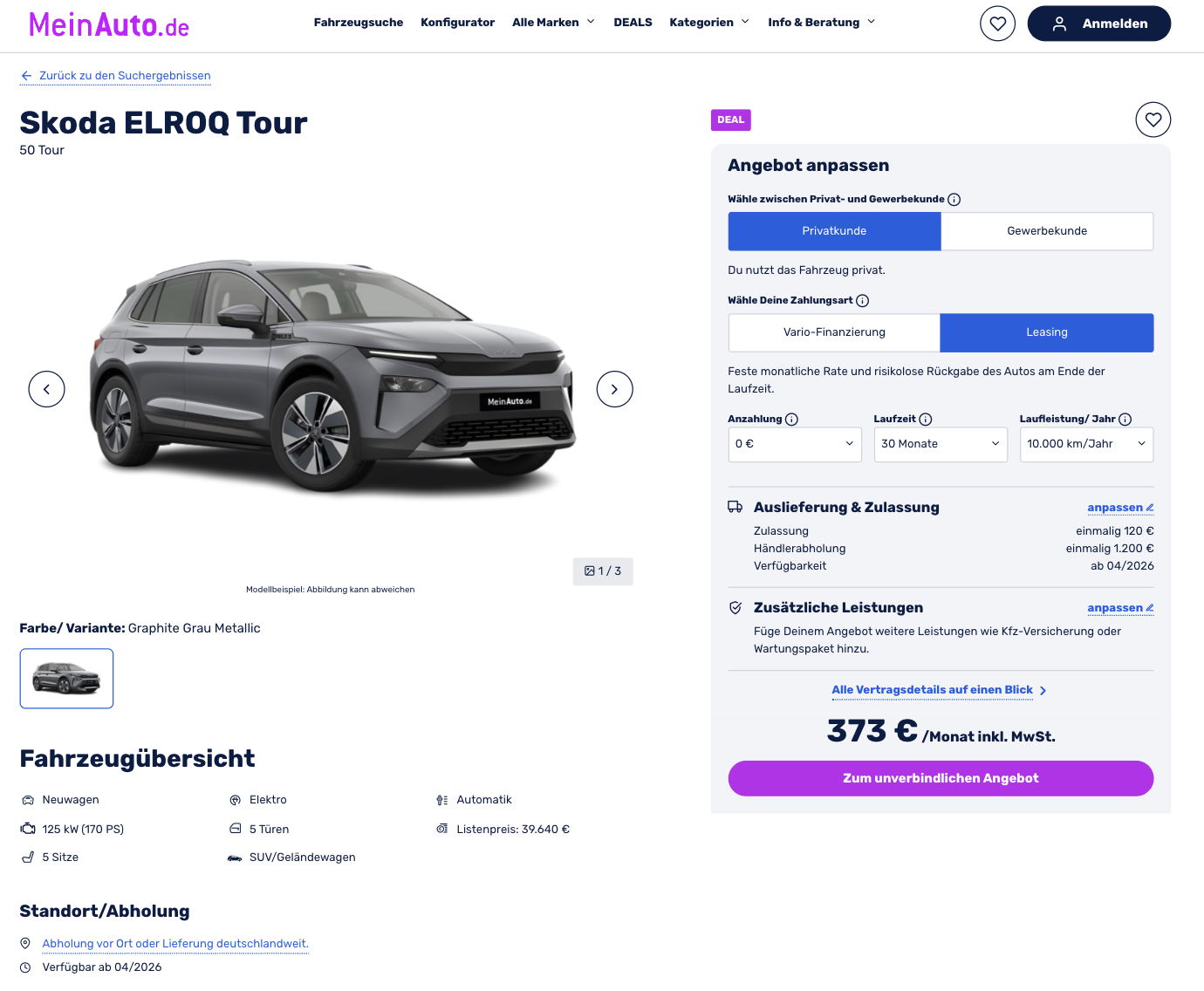 Das Angebot ist mit 30 Monaten Laufzeit und 10.000 Kilometern pro Jahr kalkuliert. Gerade die Kombination aus bereits bestelltem Fahrzeug, klarer Rate ohne Sonderzahlung und der angekündigten Verfügbarkeit ab April 2026 macht den Elroq Deal attraktiv. Dazu kommt ein seltener Punkt im Markt, beim Platzhirsch ist der Elroq mit dieser Motorisierung aktuell nicht bestellbar.