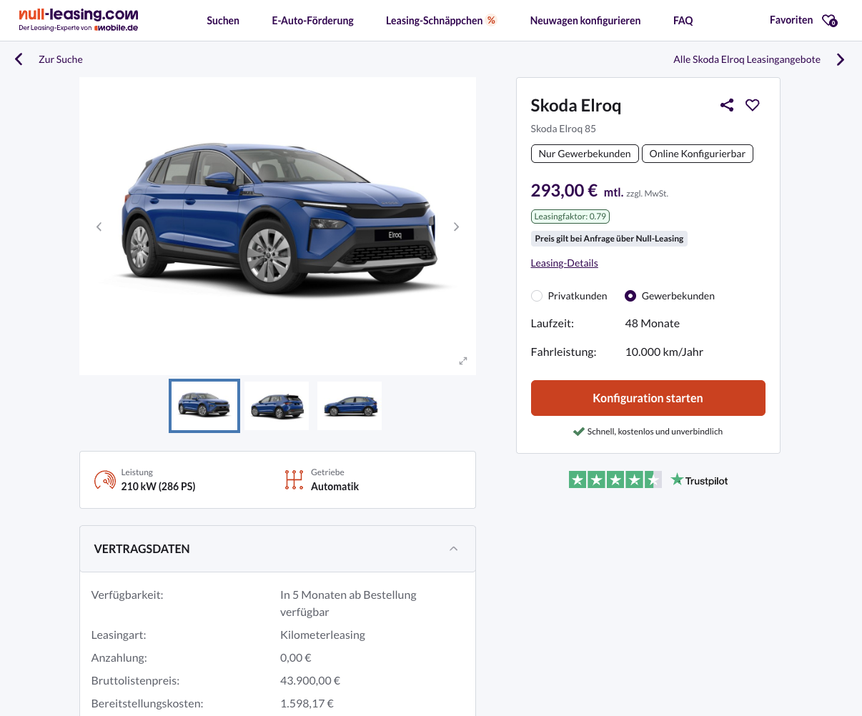 Steigende Kraftstoffpreise machen den Umstieg auf Elektro immer attraktiver. Bei Null-Leasing gibt es den Škoda Elroq 85 bei Null-Leasing für 293 Euro netto im Monat im Geschäftsleasing, eine gute Kombination aus Effizienz, Leistung und Alltagstauglichkei. Das Angebot gilt für ein frei konfigurierbares Bestellfahrzeug, die Lieferzeit liegt aktuell bei rund fünf Monaten und bleibt damit im Rahmen für ein individuell zusammengestelltes Modell.