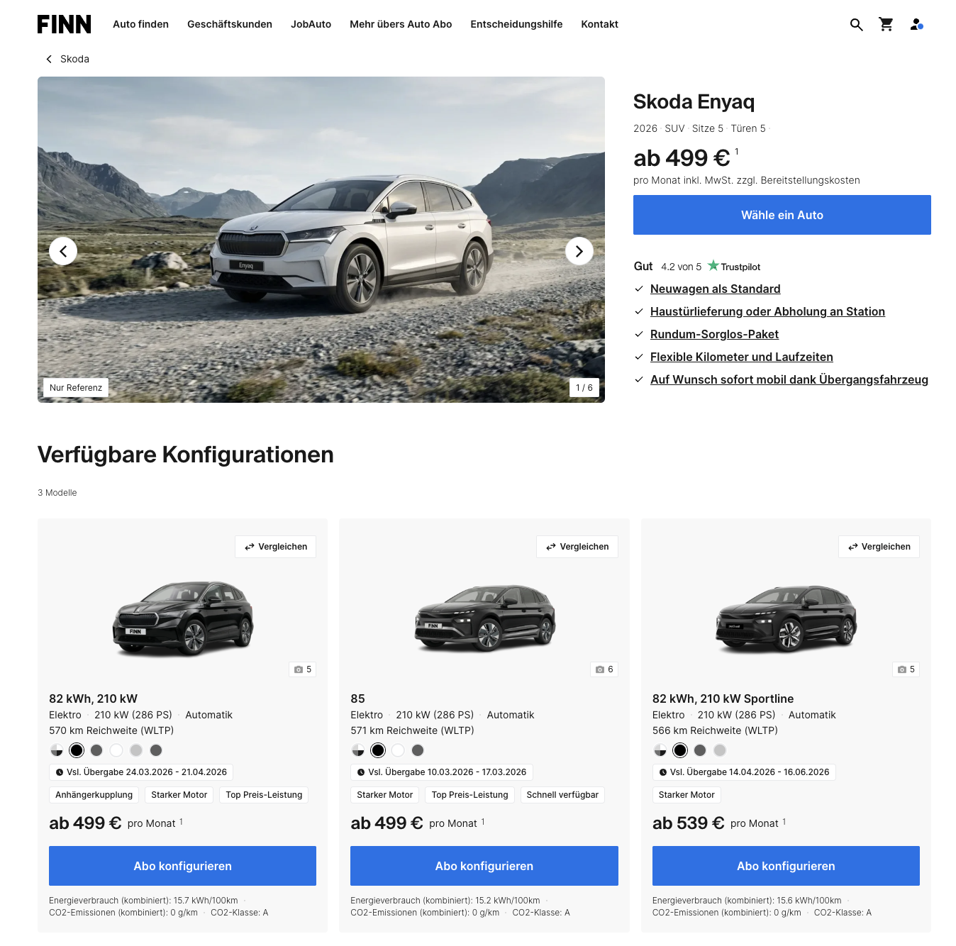 Großer Stromer, klare Kosten, schnelle Verfügbarkeit! Den Škoda Enyaq 82 kWh, 210 kW gibt es im All-inclusive Auto-Abo bei FINN für 499 Euro brutto pro Monat. Zulassung, TÜV, Inspektionen, Verschleiß und Reifenwechsel sind bereits enthalten, nur das Laden kommt on top. Dazu kommt der praktische Teil, Lieferung bis zur Haustür oder Abholung an einer Station, und endlich mal ein Zeitfenster, das man einplanen kann, lieferbar zwischen 24.03.2026 und 21.04.2026.
