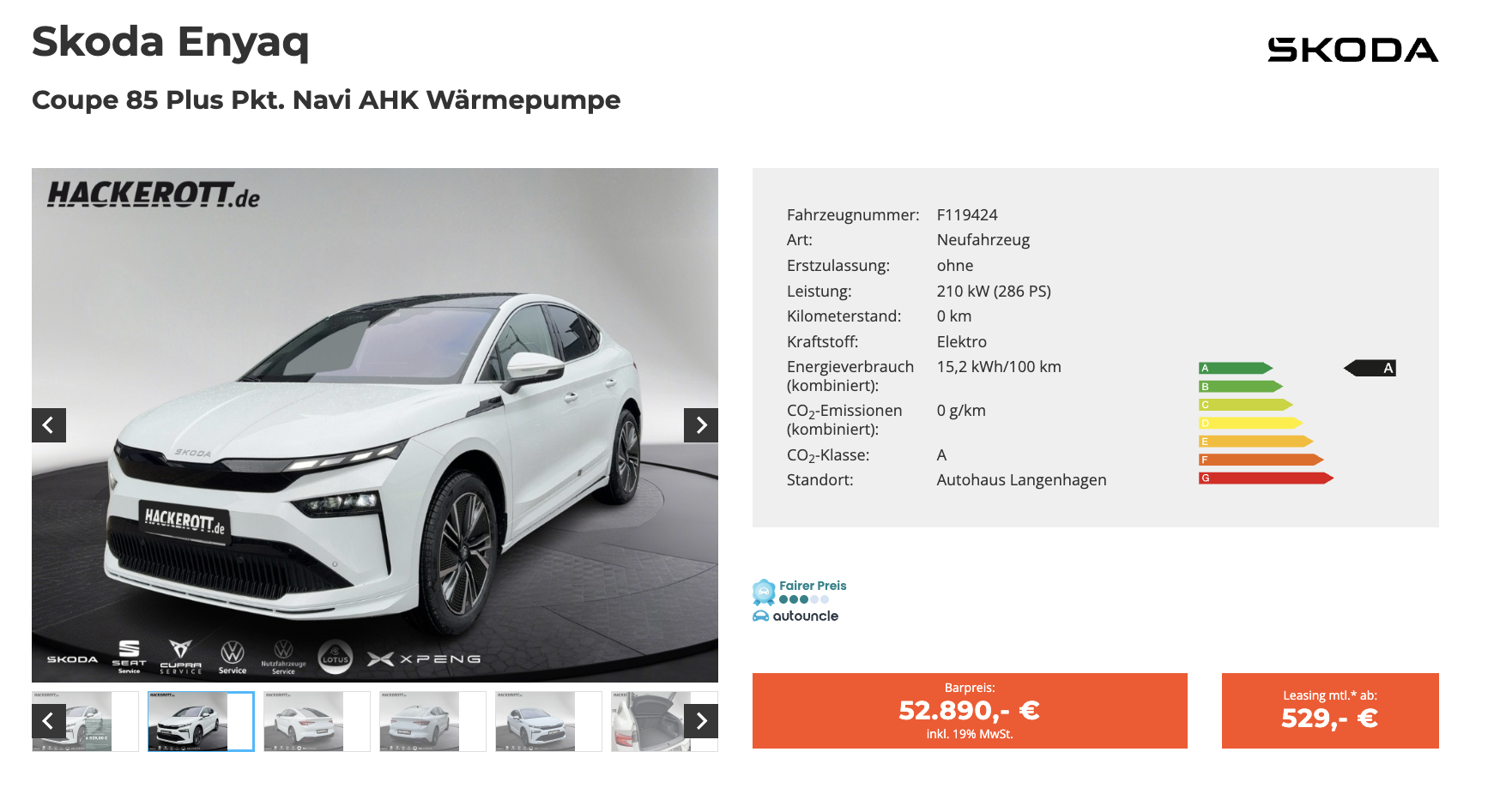 Der Škoda Enyaq Coupé 85 bei Hackerott für 52.890 Euro brutto richtet sich an alle, die ein modernes Elektroauto mit markantem Auftritt und viel Alltagstauglichkeit suchen. In Moon Weiß Perleffekt wirkt das Coupé-SUV besonders elegant und unterstreicht die fließende Linienführung des Modells. Gerade als Kaufangebot ist der Enyaq interessant, weil er die emotionale Form eines SUV-Coupés mit den praktischen Qualitäten eines geräumigen Familienfahrzeugs verbindet. Dazu kommt ein Antrieb, der nicht nur leise und souverän arbeitet, sondern auch auf längeren Strecken überzeugende Reserven mitbringt.