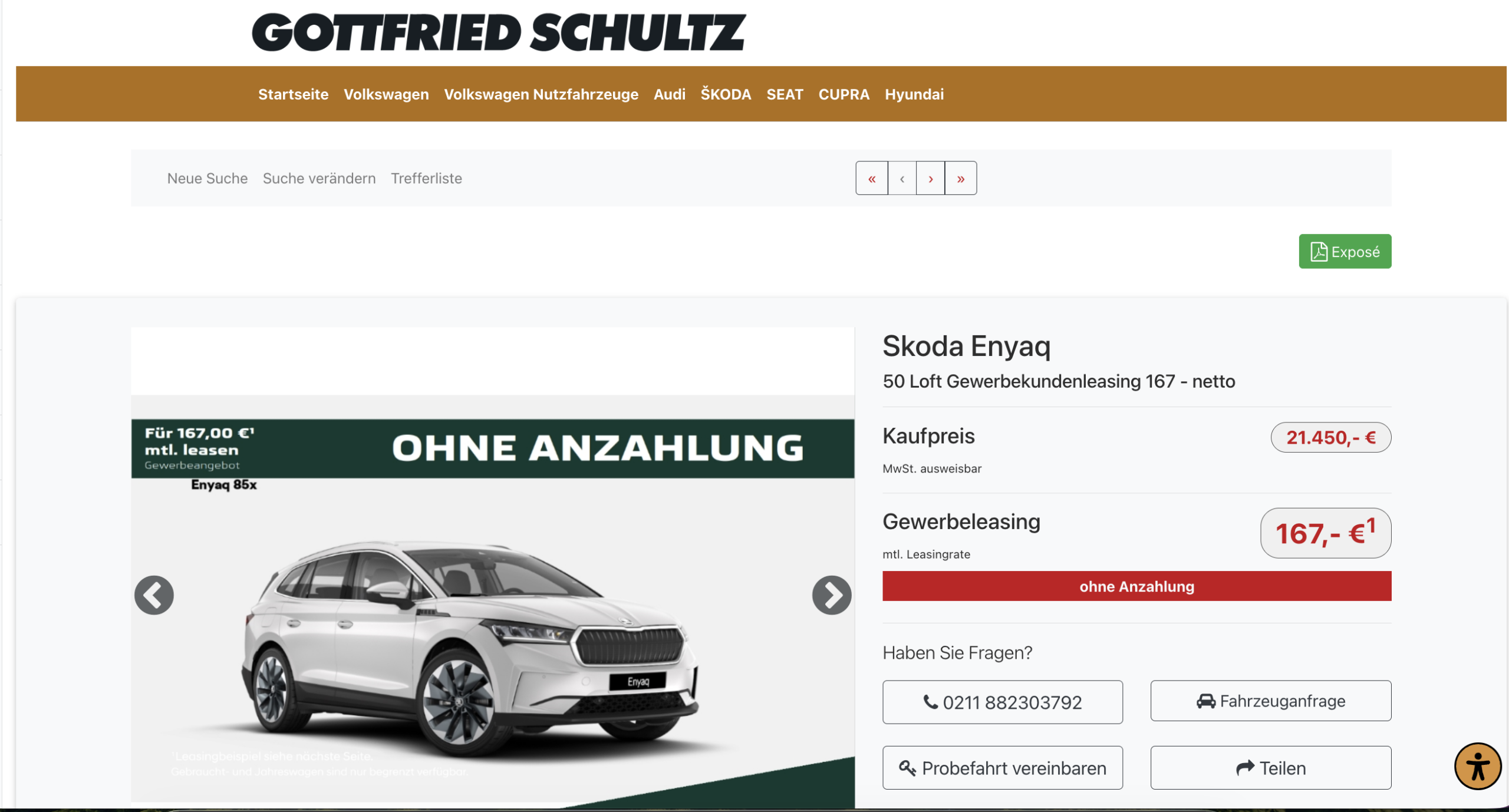 Dieser Gebrauchtwagen, Erstzulassung November 2023 und mit einer Laufleistung von 21.140 Kilometern, bietet ein modernes Elektro-SUV mit nur einem Vorbesitzer. Wer sich nicht auf Leasing festlegen möchte, kann den Enyaq direkt kaufen. Der Preis liegt bei 21.450 Euro brutto,.