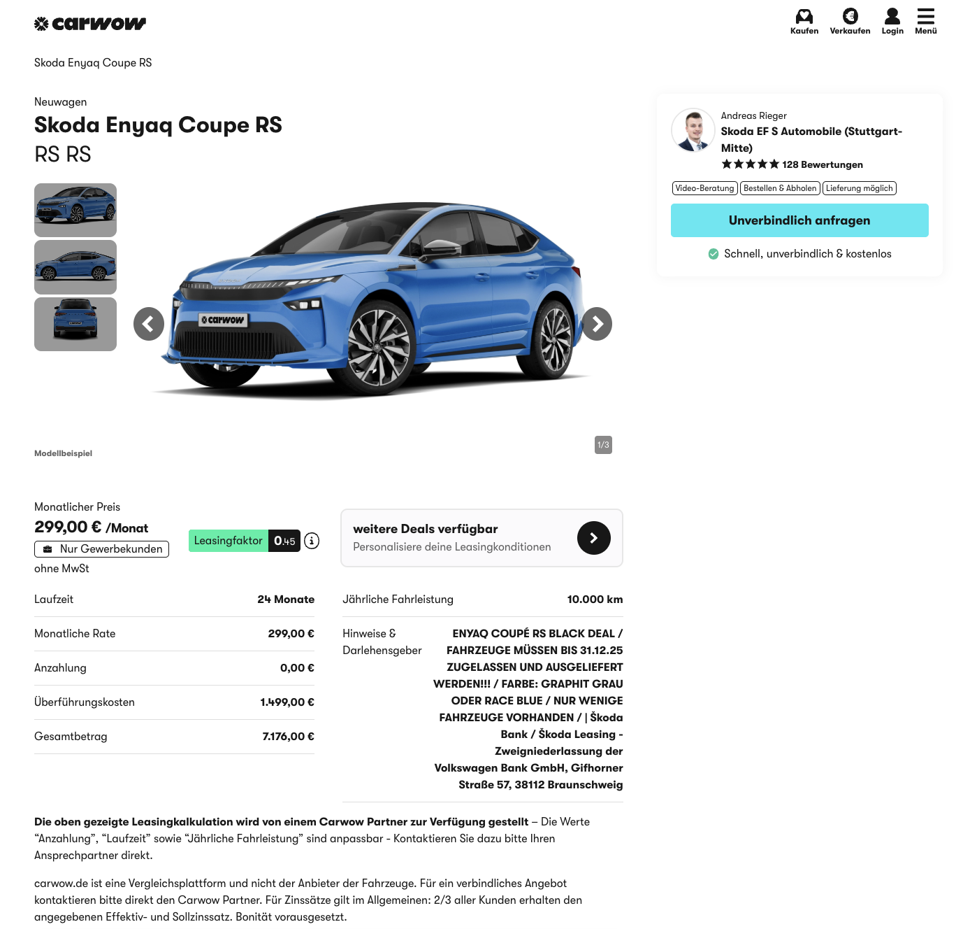 Elektro-Coupé mit RS-Schärfe, bereit für Alltag. Bei carwow gibt es aktuell den Škoda Enyaq Coupé RS für 299 Euro netto pro Monat, im Geschäftsleasing. Es sind nur wenige Fahrzeuge auf Lager in Graphit Grau oder Race Blue. Einzige Voraussetzung ist die Zulassungspflicht in 2025.
