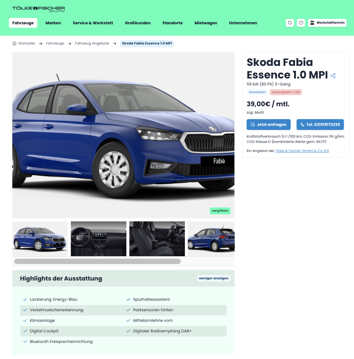 Das Angebot läuft über 24 Monate bei 10.000 Kilometern pro Jahr, beides lässt sich bei Bedarf anpassen, wenn euer Profil anders aussieht. Besonders deutlich wird der Deal im Vergleich, denn der Marktführer verlangt für denselben Fabia aktuell 87 Euro netto monatlich. Wer die Loyalitätsbedingung erfüllt und einen günstigen Kleinwagen für den Geschäftsalltag sucht, bekommt hier ein Paket, das in der Praxis kaum einfacher und wirtschaftlicher sein kann.