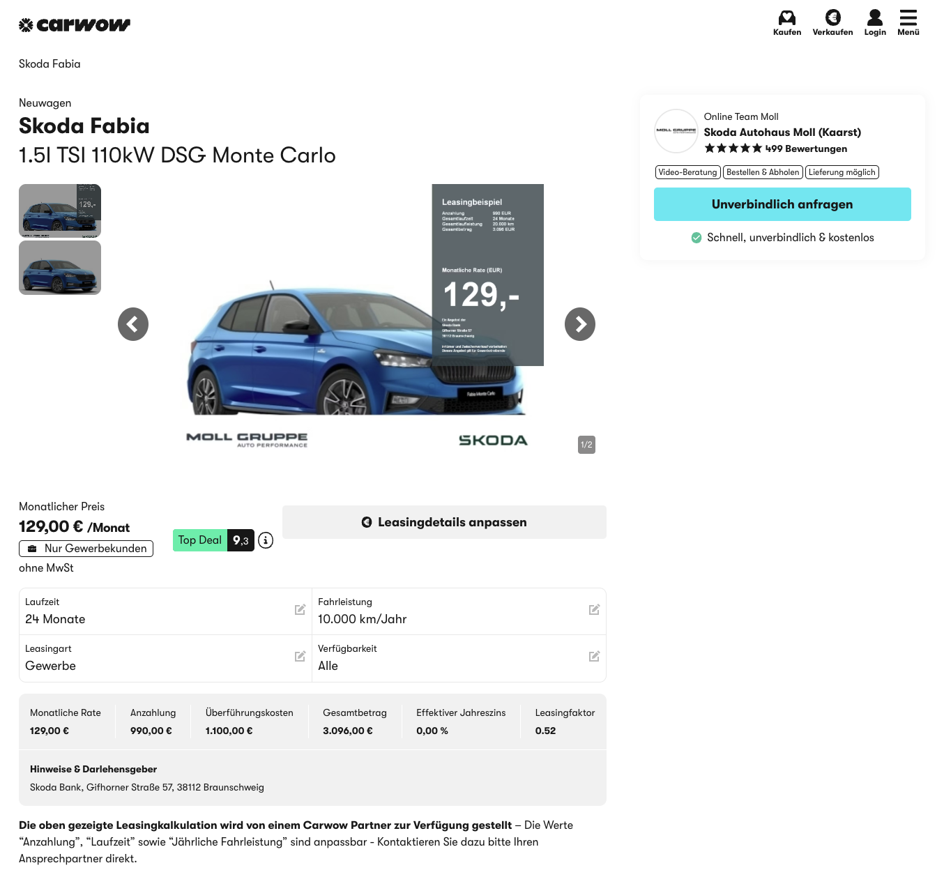 Škoda Fabia Leasing für 129 [170] Euro im Monat netto [sofort verfügbar]