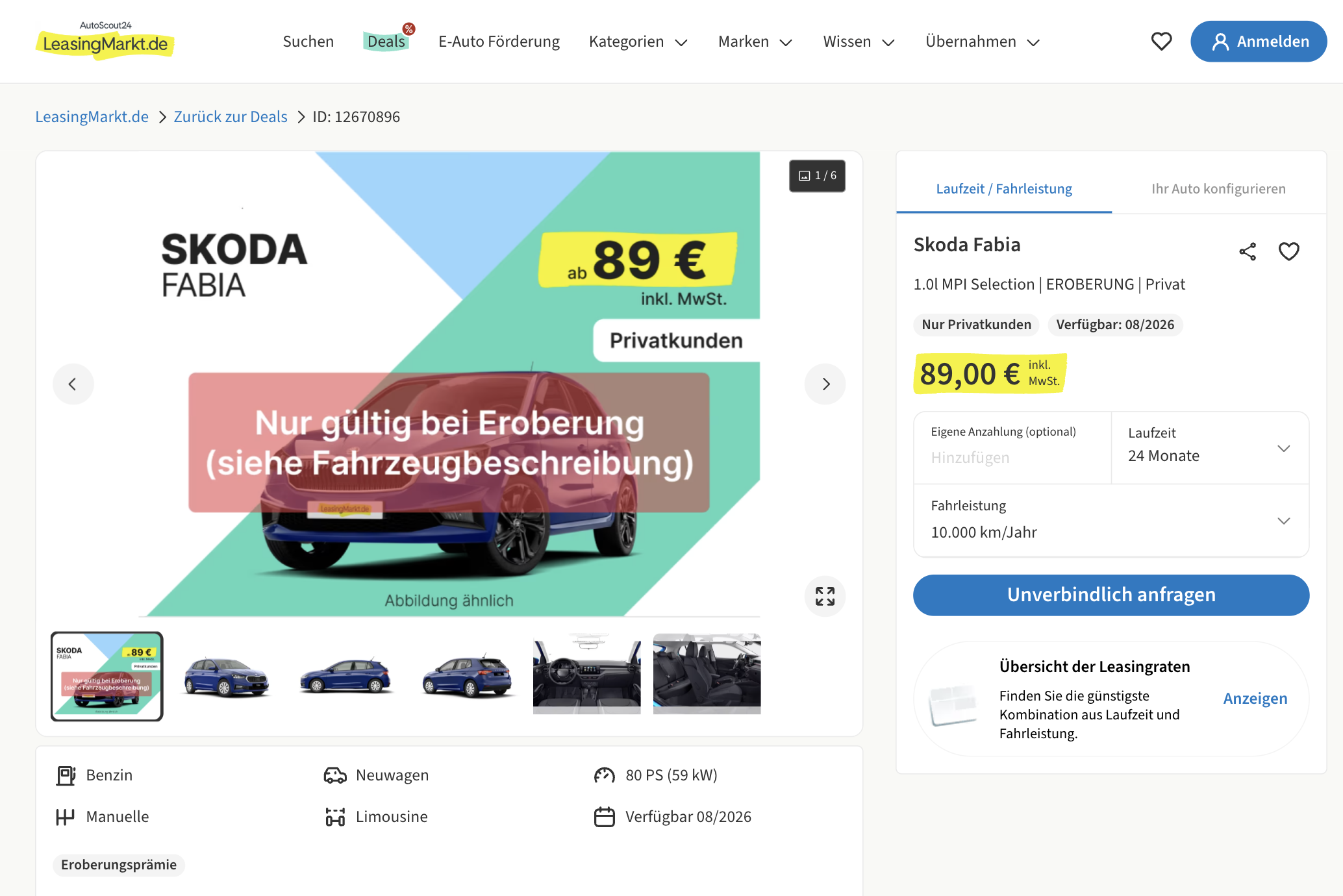 Die Leasingkonditionen wurden mit 24 Monaten Laufzeit und 10.000 Kilometern pro Jahr kalkuliert, Anpassungen sind möglich. Mit 89 Euro brutto monatlich positioniert sich dieses Angebot deutlich unter vielen vergleichbaren Deals. Zum Vergleich verlangt der Marktführer aktuell rund 165 Euro brutto im Monat für einen ähnlich ausgestatteten Škoda Fabia. Damit gehört dieses Leasingangebot zu den günstigeren Einstiegen in die Kleinwagenklasse.