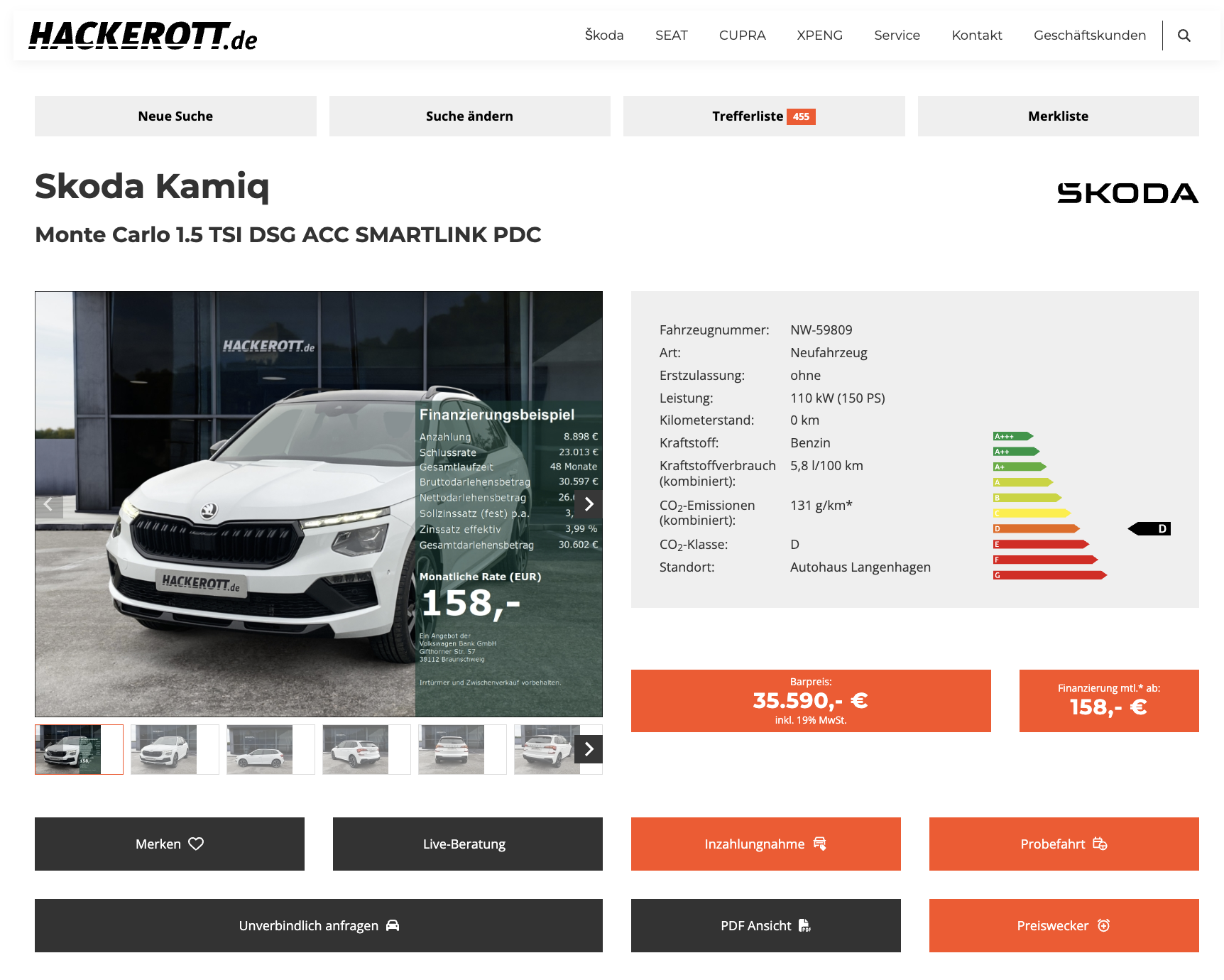 Ein kompaktes City-SUV mit Sportnote und viel Alltagstalent. Bei Hackerott könnt ihr den Škoda Kamiq 1.5 TSI 110 kW DSG für nur 158 Euro brutto im Monat finanzieren, mit 8.898 Euro Anzahlung, 48 Monaten Laufzeit, 23.013 Euro Schlussrate und 3,99 Prozent effektivem Jahreszins. Der Wagen ist sofort verfügbar und inCandy-Weiß Uni erhältlich.