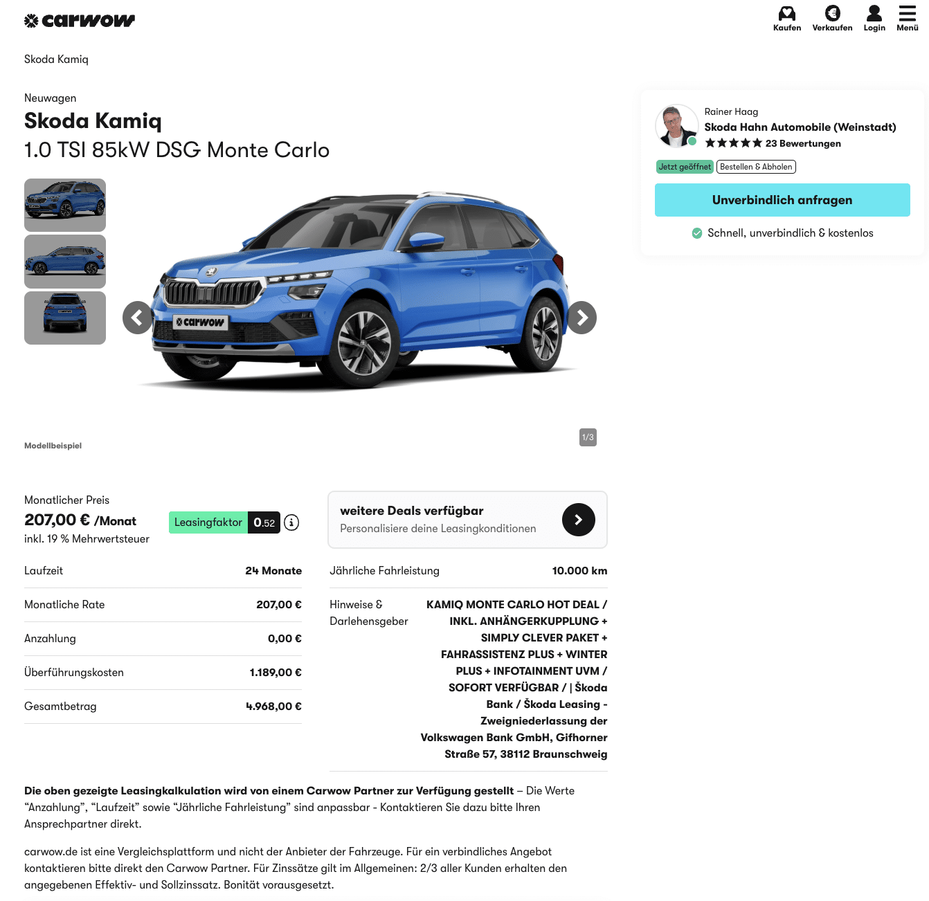 Das Angebot von carwow ist auf 24 Monate Laufzeit und 10.000 Kilometer im Jahr ausgelegt.