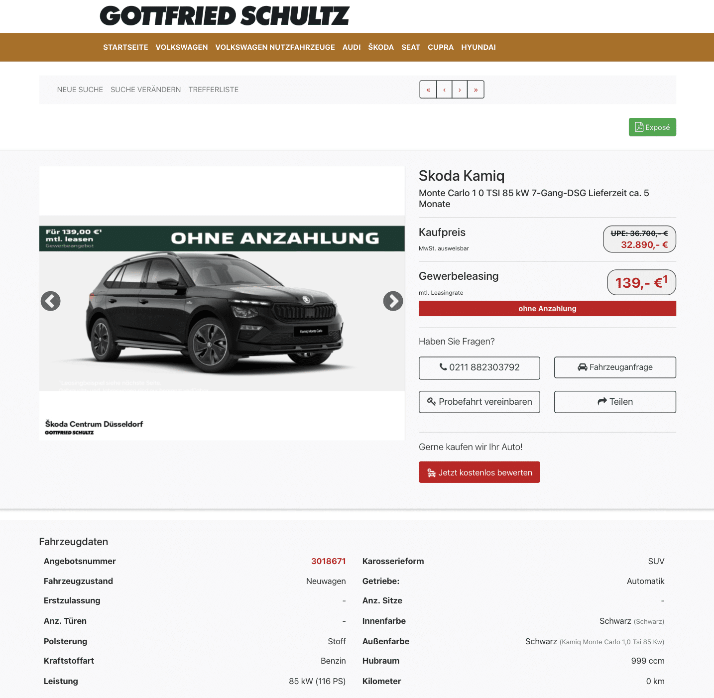 Preisgünstige SUV mit üppiger Ausstattung und DSG-Getriebe. Der Škoda Kamiq 1.0 TSI 85 kW DSG Monte Carlo steht bei Gottfried Schultz im Geschäftsleasing für 139 Euro netto pro Monat bereit. Es handelt sich um ein frei konfigurierbares Bestellfahrzeug, also volle Wahl bei Lack, Rädern und Paketen. Die Laufzeit ist auf 24 Monate mit 10.000 km/Jahr ausgelegt.