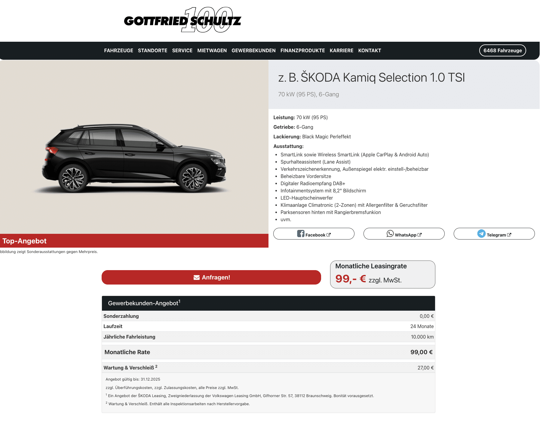 Transparente Rechnung, 24 Monate, 10.000 km pro Jahr, 0 Euro Anzahlung, fertig ist der Business Fit. Der Blick über den Tellerrand bestätigt den Deal, beim Marktführer stehen 247 Euro netto pro Monat für ein vergleichbares Fahrzeug in der Liste, Gottfried Schultz ruft 99 Euro netto auf, also ein Bruchteil. Wer für das Team ein kompaktes, sparsames und gut vernetztes B-SUV sucht, das im Alltag unauffällig funktioniert und in der Kalkulation glänzt, steigt hier richtig ein. Preis, Paket, Planung, alles spricht für den Kamiq Selection.