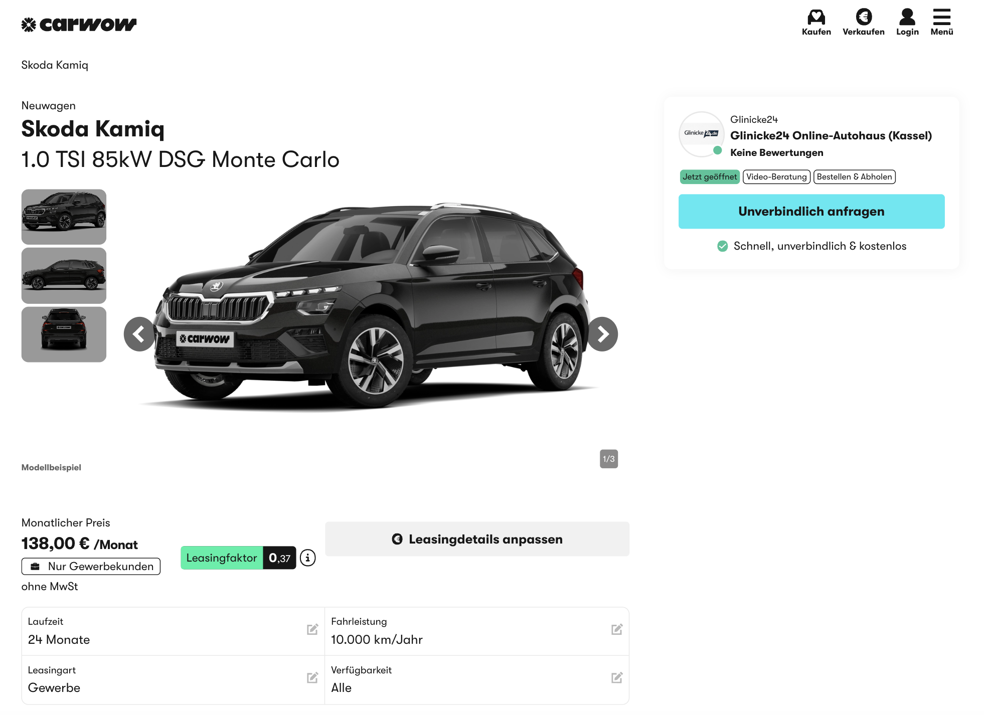 Kompakt genug für die City und erwachsen genug für den täglichen Pendelrhythmus. Škoda Kamiq 1.0 TSI 85 kW DSG Monte Carlo bei carwow für 138 Euro netto im Monat im Geschäftsleasing oder 160 Euro brutto im Monat im Privatleasing, sofort verfügbar in Black Magic Perleffekt. Genau die Sorte Deal, die im Jahresendspurt gut passt, weil nicht erst lange geplant werden muss, sondern einfach funktioniert.