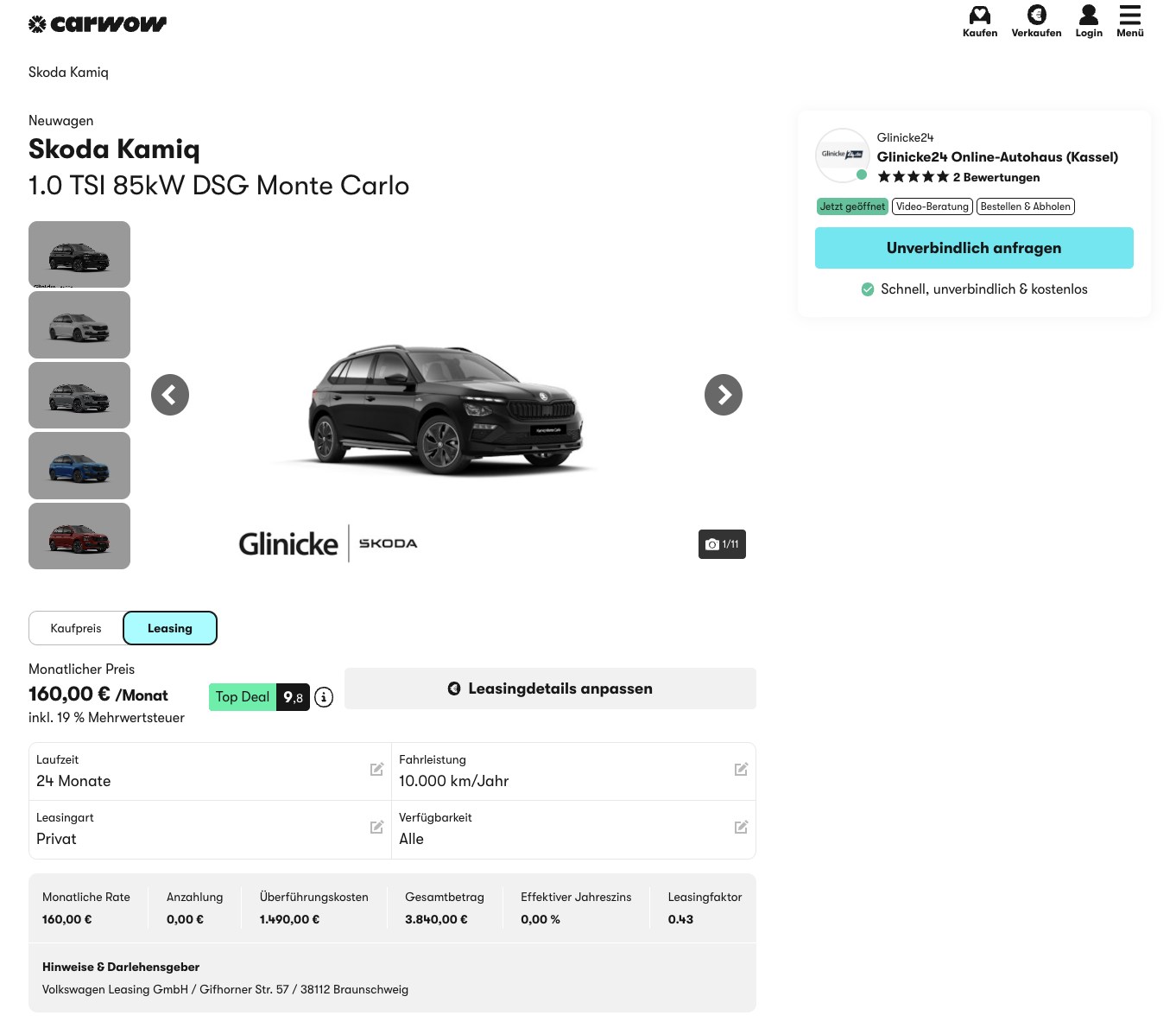 Škoda Kamiq Leasing für 160 Euro im Monat brutto