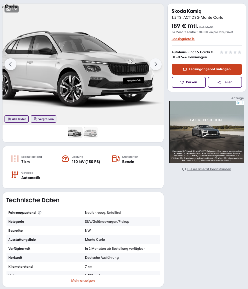Kalkuliert ist das Angebot auf 24 Monate Laufzeit und 10.000 Kilometer pro Jahr. Besonders interessant wird der Deal im Vergleich, denn laut Angabe liegt der Platzhirsch für einen Škoda Kamiq bei rund 375 Euro brutto pro Monat. Mit 189 Euro brutto bewegt sich dieses Angebot damit in einer völlig anderen Preisregion.