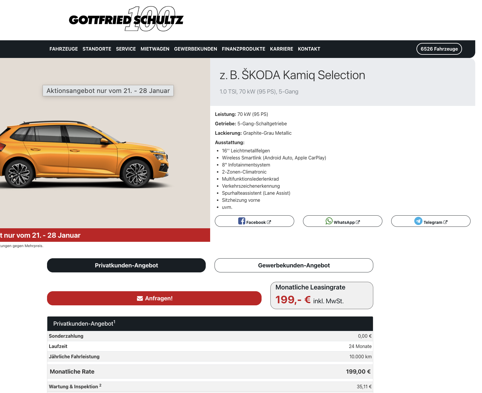 Nicht jeder möchte aktuell elektrisch fahren, und genau dafür sind solide Verbrenner-Angebote wie dieses gemacht. Bei Gottfried Schultz gibt es eine Leaisng-Aktion mit dem Škoda Kamiq 1.0 TSI 70kW Selection für 199 Euro im Monat brutto inklusive Überführungskosten. Wichtig dabei: Das Aktionsangebot ist zeitlich begrenzt und gilt nur vom 21. bis 28. Januar. Wer den Deal nutzen möchte, sollte also nicht zu lange überlegen.