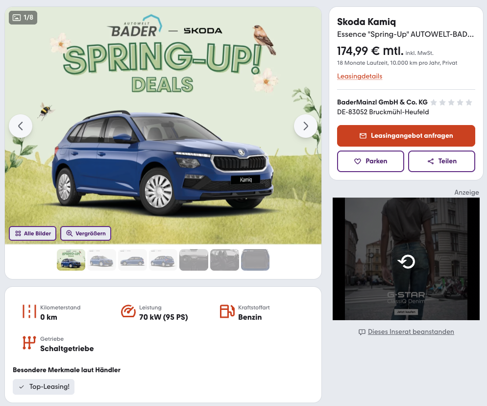 Auch die Konditionen wirken erfreulich klar. Gerechnet wurde mit 18 Monaten Laufzeit und 10.000 Kilometern pro Jahr, also mit einer eher kurzen und gut planbaren Vertragsdauer. Richtig interessant wird der Deal aber beim Blick auf den Wettbewerb. Während der Marktführer für einen vergleichbaren Kamiq derzeit 358 Euro brutto pro Monat aufruft, steht dieses Angebot mit 174,99 Euro brutto deutlich günstiger da. Das ist nicht einfach nur ein kleiner Vorteil, sondern ein echter Abstand.