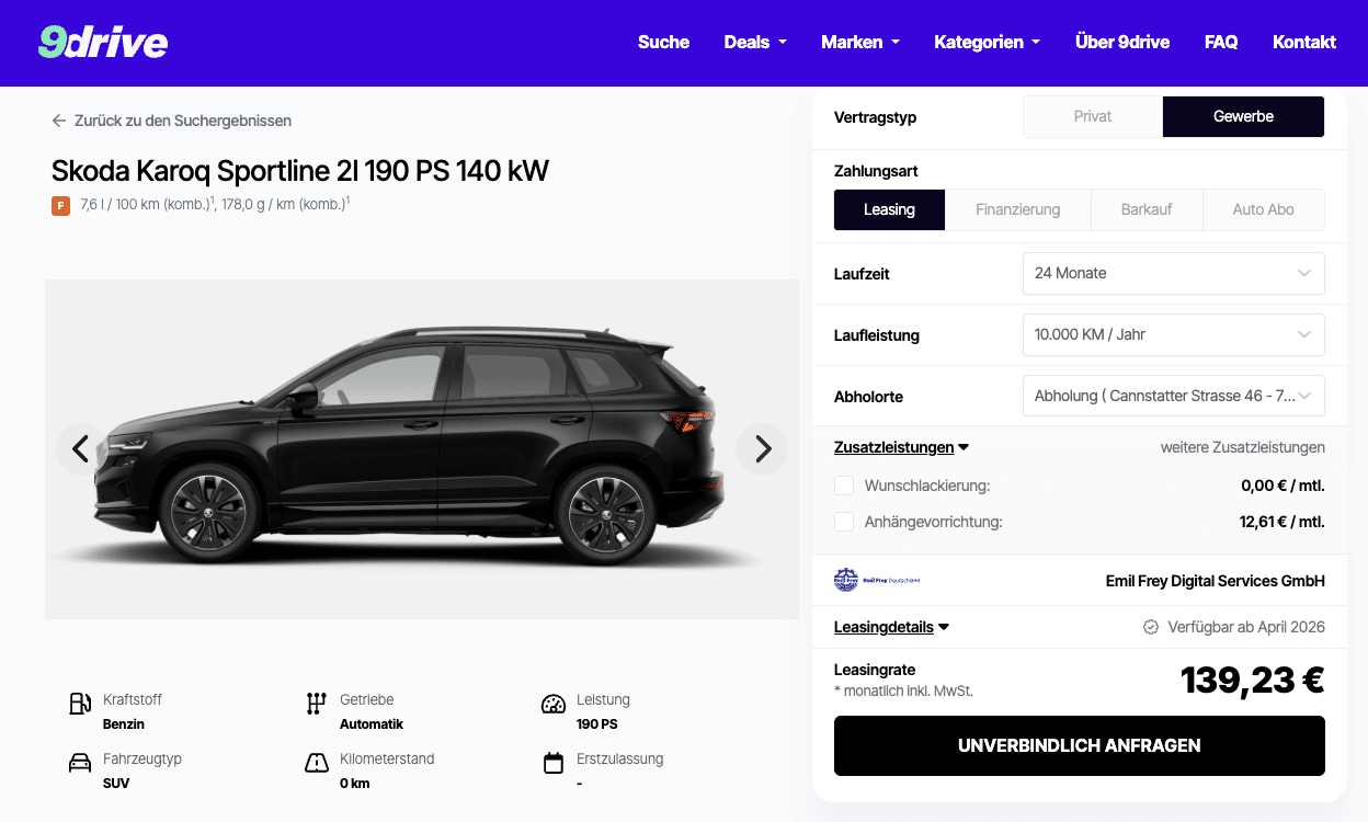 Er ist sportlich, souverän und smarter kalkuliert als je zuvor! Bei 9drive bekommt ihr den Ĺ koda Karoq 2.0 TSI DSG 4×4 Sportline derzeit fĂĽr gerade einmal 117 Euro netto im Monat im Geschäftsleasing. Dieses KRACHER-Angebot hat einen Leasingfaktor von 0,30. Das Angebot gilt fĂĽr ein frei konfigurierbares Bestellfahrzeug, das ihr bis ins Detail selbst gestalten könnt, von der Lackfarbe ĂĽber das Interieur bis hin zu den Ausstattungspaketen. Die Auslieferung ist fĂĽr April 2026 geplant.