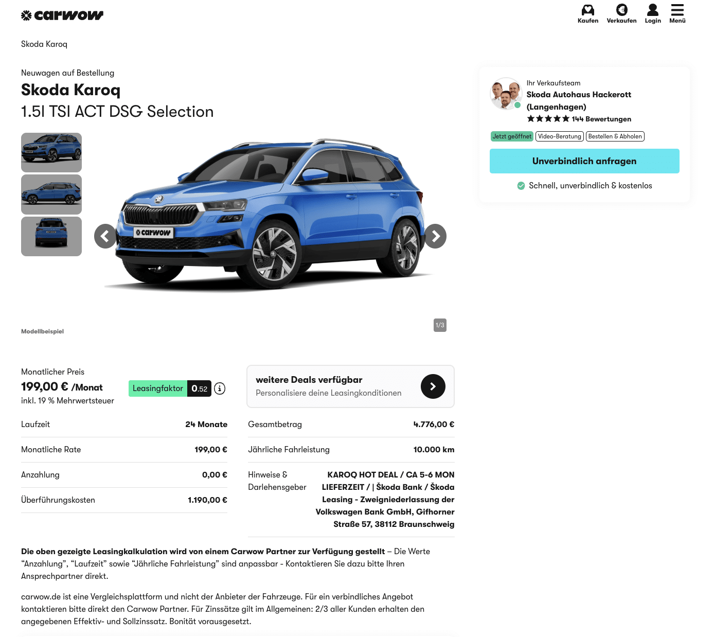 Das Angebot ist klar und kurz gestrickt: 24 Monate Laufzeit, 10.000 Kilometer pro Jahr, auf Wunsch flexibel anpassbar. Und der Vergleich zeigt die Substanz hinter der Zahl: Beim Marktführer steht das identisch motorisierte Modell aktuell mit rund 286 Euro brutto/Monat in der Liste. carwow liegt mit 199 Euro, 87 Euro darunter, in 24 Monaten sind das 2.088 Euro Ersparnis.