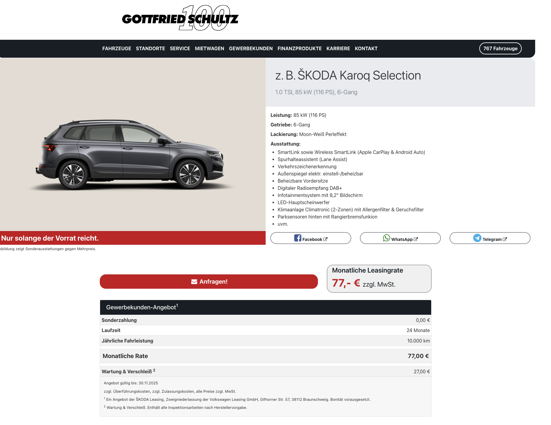 Ein sauber kalkulierter Einstieg in die SUV-Welt! Bei Gottfried Schultz bekommt ihr den Škoda Karoq 1.0 TSI 85 kW Selection im Geschäftsleasing für 77 Euro netto pro Monat. Es handelt sich um ein frei konfigurierbares Bestellfahrzeug, ihr legt Lack, Räder und Pakete selbst fest. Die Lieferzeit beträgt rund sechs Monate, der Leasingfaktor liegt bei 0,26, klare Zahlen, wenig Rätselraten.
