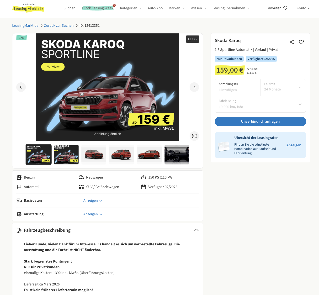 Das Angebot bei LeasingMarkt ist auf 24 Monate Laufzeit und 10.000 Kilometer pro Jahr ausgelegt. Richtig interessant wird es im direkten Vergleich. Ein großer Marktführer ruft für einen ähnlich konfigurierten Karoq rund 420 Euro brutto im Monat auf. Hier stehen 159 Euro brutto in der Zeile, das sind etwa 261 Euro weniger pro Monat, über zwei Jahre summiert sich dieser Vorsprung auf rund 6.264 Euro.