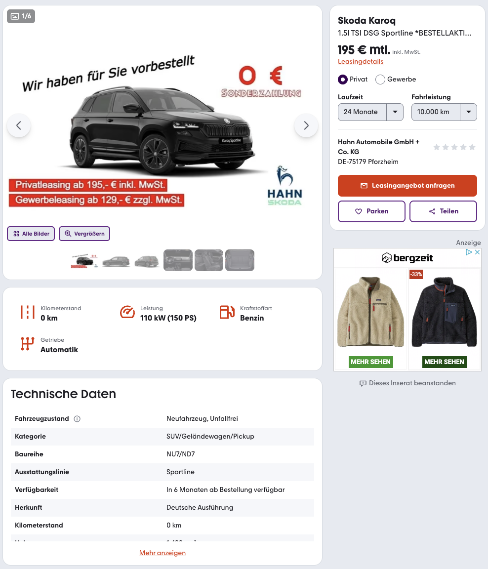 Das Angebot bei mobile.de ist auf 24 Monate und 10.000 Kilometer pro Jahr ausgelegt, Anpassungen bei Laufzeit und Kilometerleistung sind in der Regel möglich. Im Marktvergleich wirkt der Škoda Karoq besonders attraktiv, denn beim Platzhirsch kostet das SUV aktuell 392 Euro brutto pro Monat.